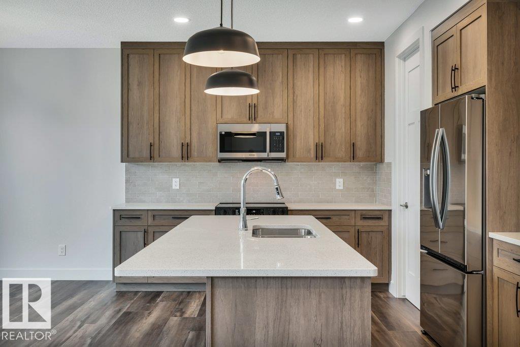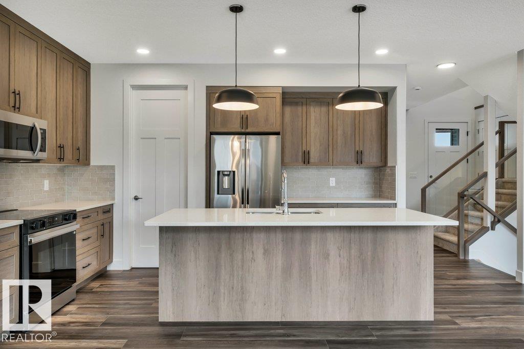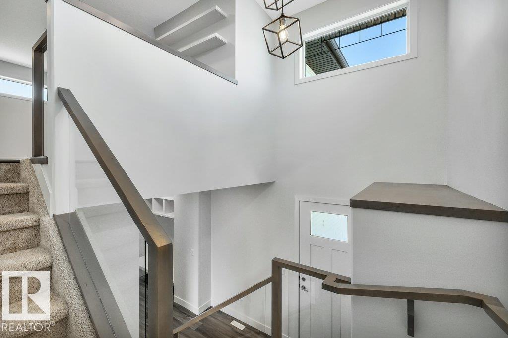 Welcome to this beautifully crafted home by Stonegate Developments, where quality and attention to detail shine throughout. From the grand front entrance, you’ll appreciate the elegant design and refined finishes. The open-concept main floor is perfect for entertaining, featuring a stylish kitchen with full-height cabinetry that leads to a deck with sleek aluminum railings. Glass panels on the staircase add a modern touch. Upstairs offers three spacious bedrooms, two bathrooms, a walk-in laundry room, and a large family room with a built-in desk—ideal for work or study. The luxurious primary suite includes a spa-inspired ensuite with a custom tiled shower. Additional highlights include quartz countertops, 8’ solid core doors, stainless steel appliances, a built-in electric fireplace, and luxury vinyl plank flooring throughout. Situated on a pie-shaped lot in a quiet cul-de-sac, this home also features a double attached garage with a floor drain and side entry. Comes with full Alberta New Home Warranty.