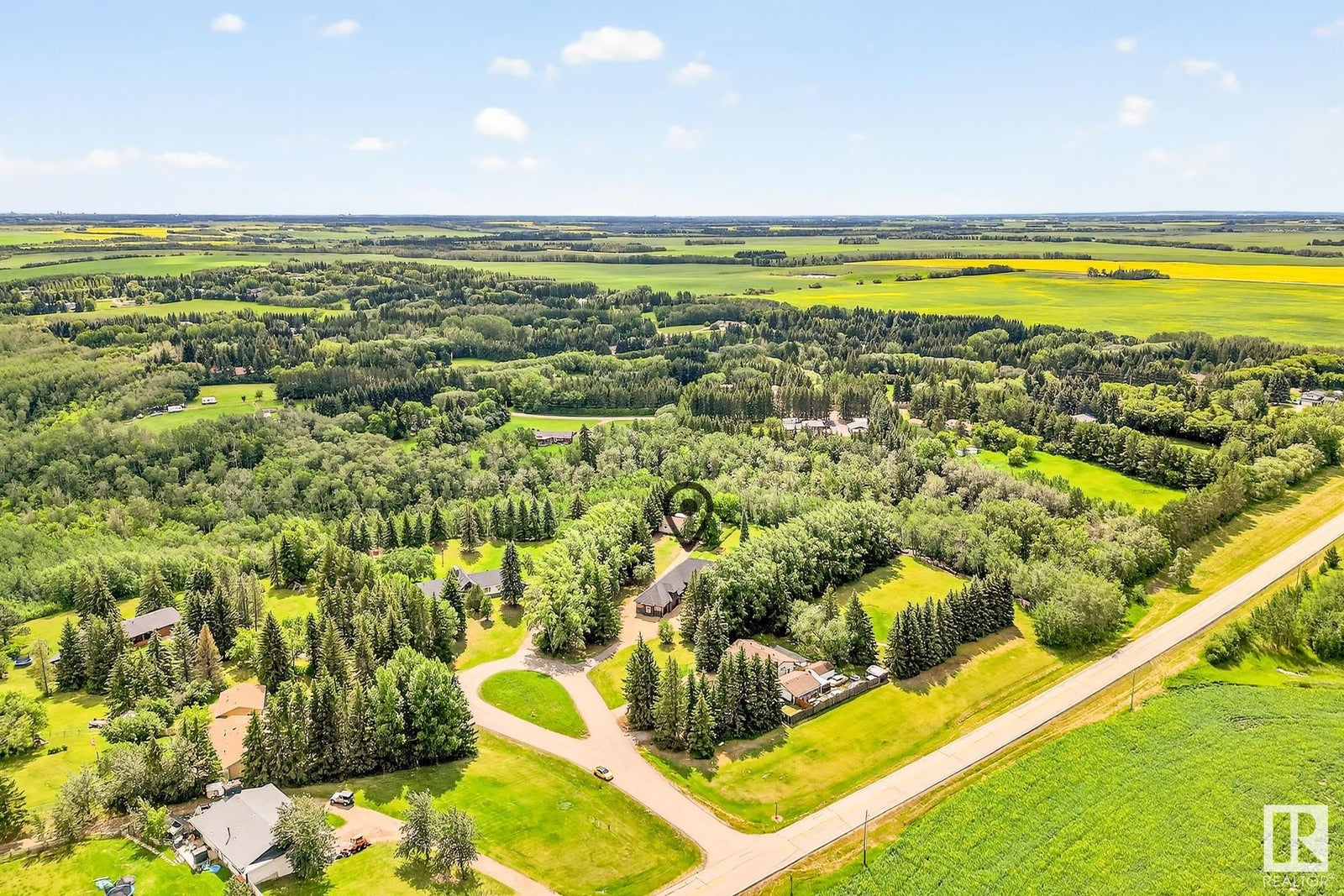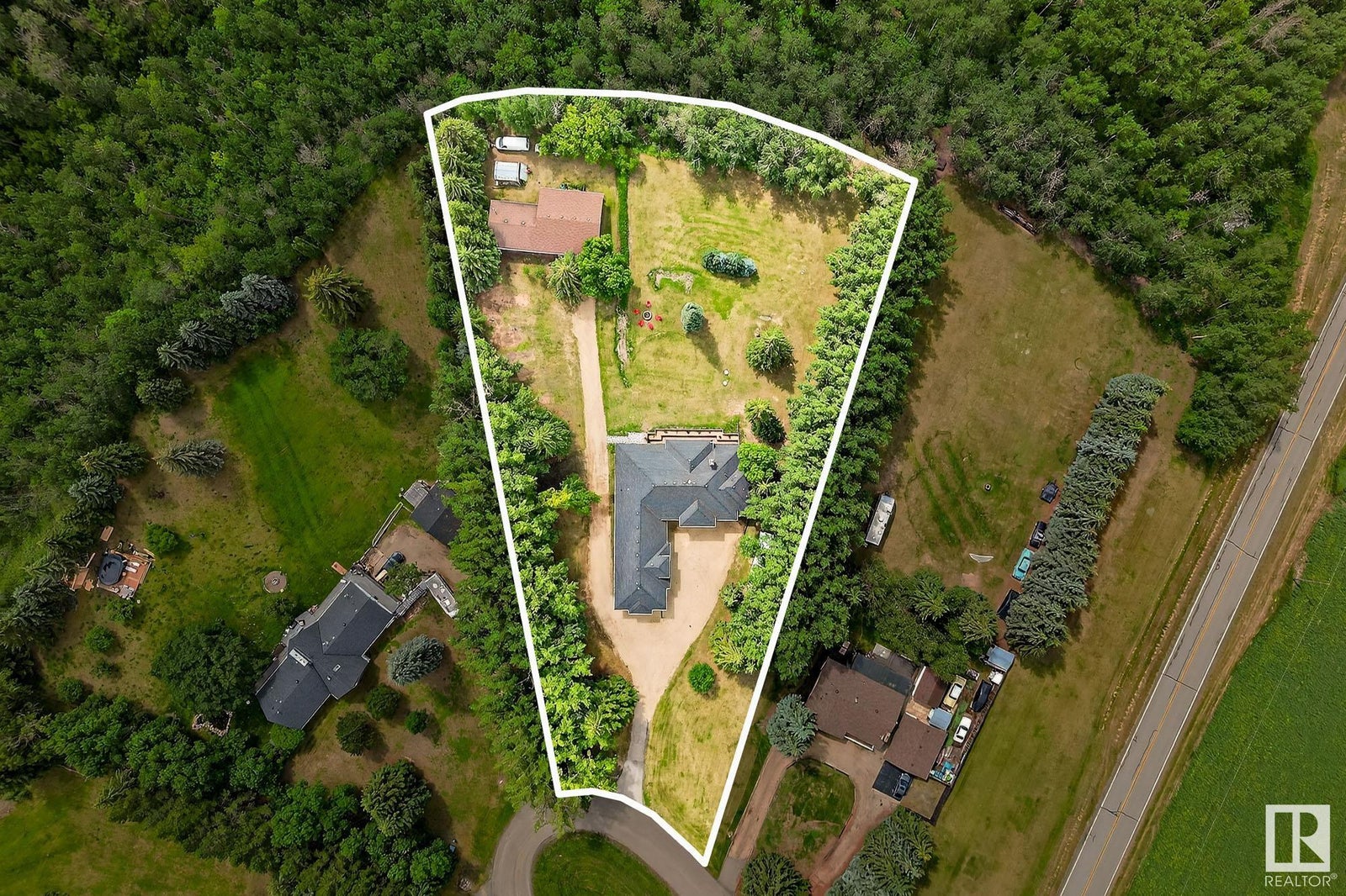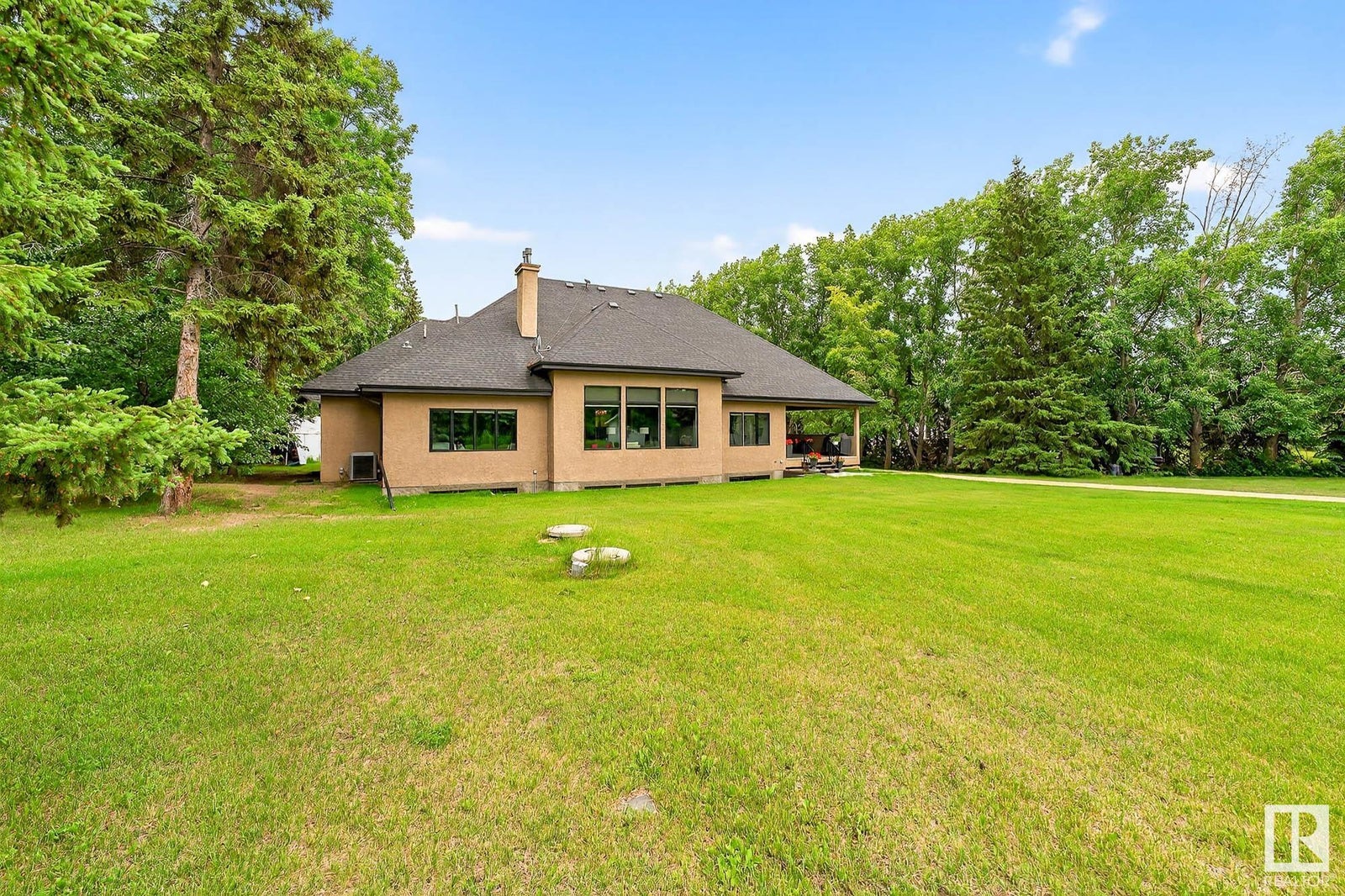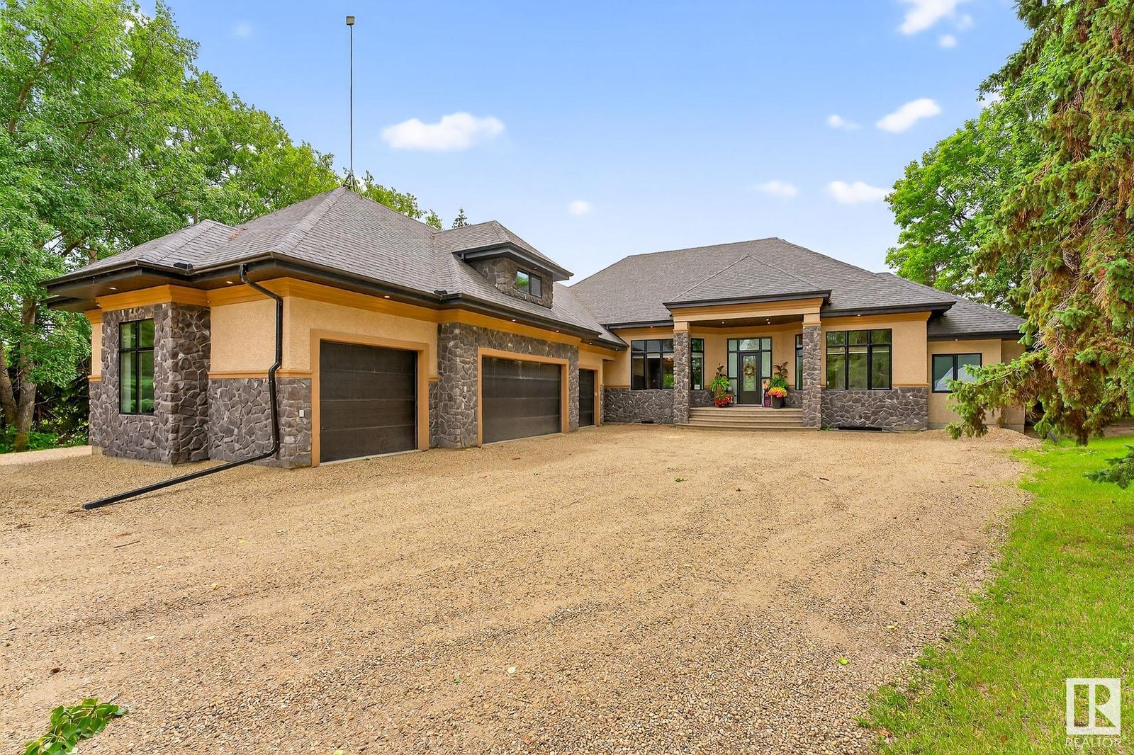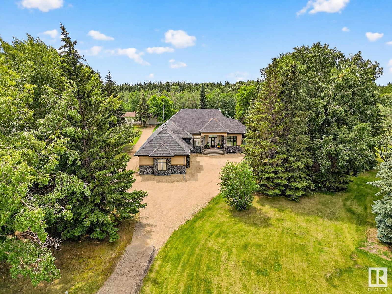 Welcome to Namao Ridge! This custom-built bungalow, situated on 1.67 acres, offers upscale living with unparalleled privacy. A dramatic curved staircase set against a stone feature wall, tray ceilings, and wall-to-wall windows elevate the open-concept main level. Enjoy a chef-inspired kitchen with rich cabinetry, granite countertops, and premium appliances, open to the living and dining areas, featuring a striking stone fireplace. The main floor includes the spacious primary suite, a second bedroom, and a formal dining room with architectural detailing. Downstairs features 3 bedrooms, a full bath, a half bath, a home gym, and a spacious rec room with room for a pool table. The show-stopping bar includes custom cabinetry, tile backsplash, and seating. A dedicated theatre room above the 4-car garage is perfect for movie nights. The 1,824sqft heated shop is finished with power, making it ideal for trades, storage, or your dream workspace. A covered patio and mature trees round out this exceptional property.