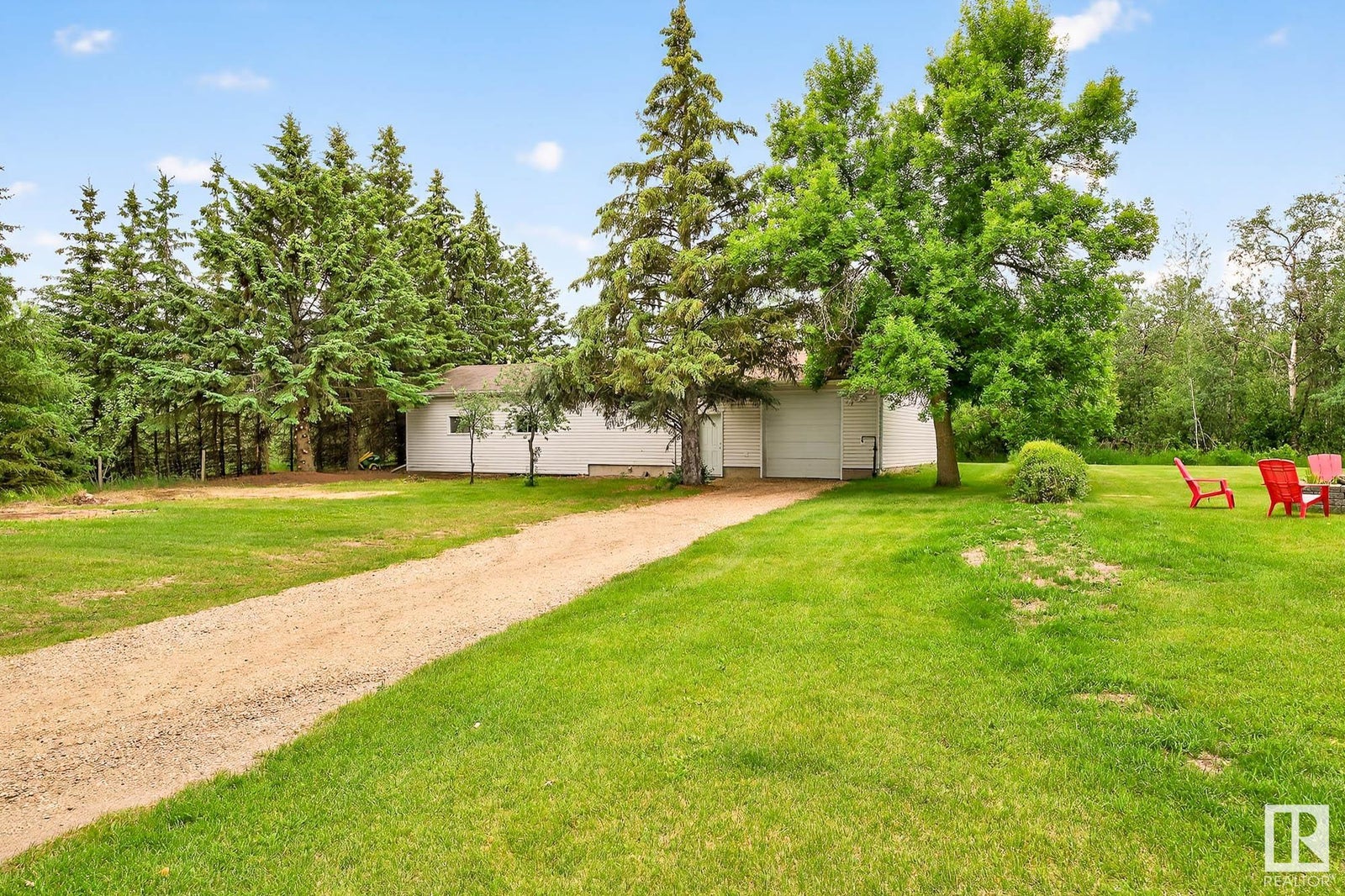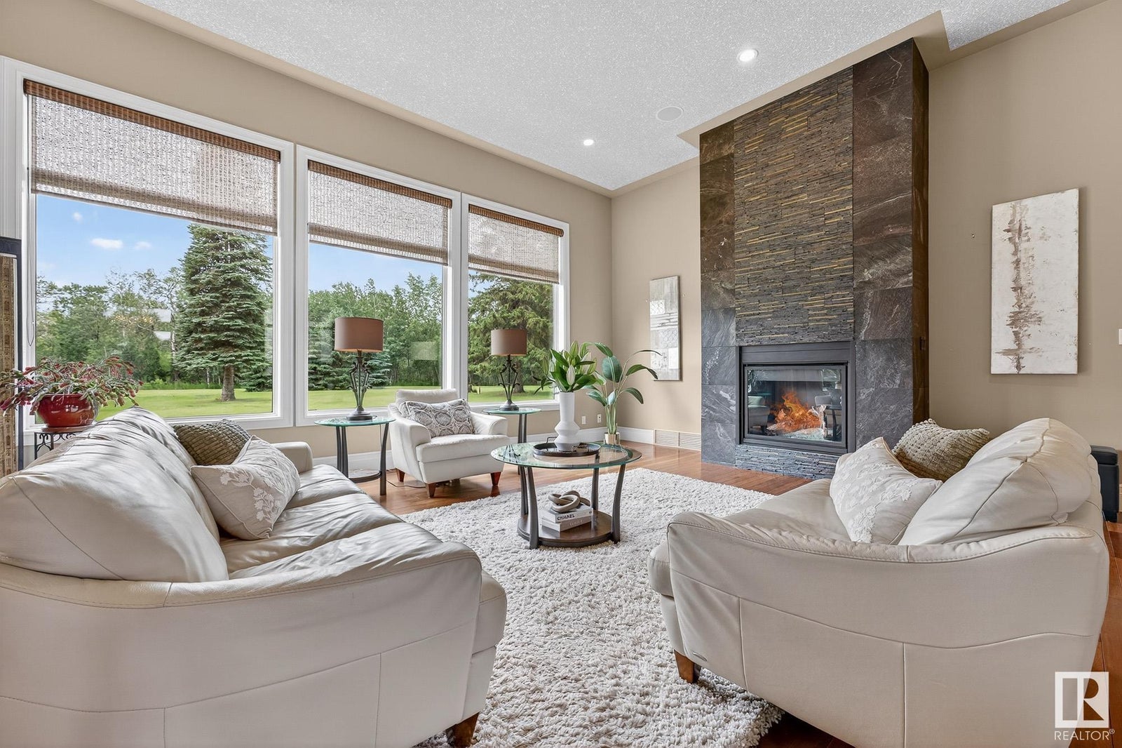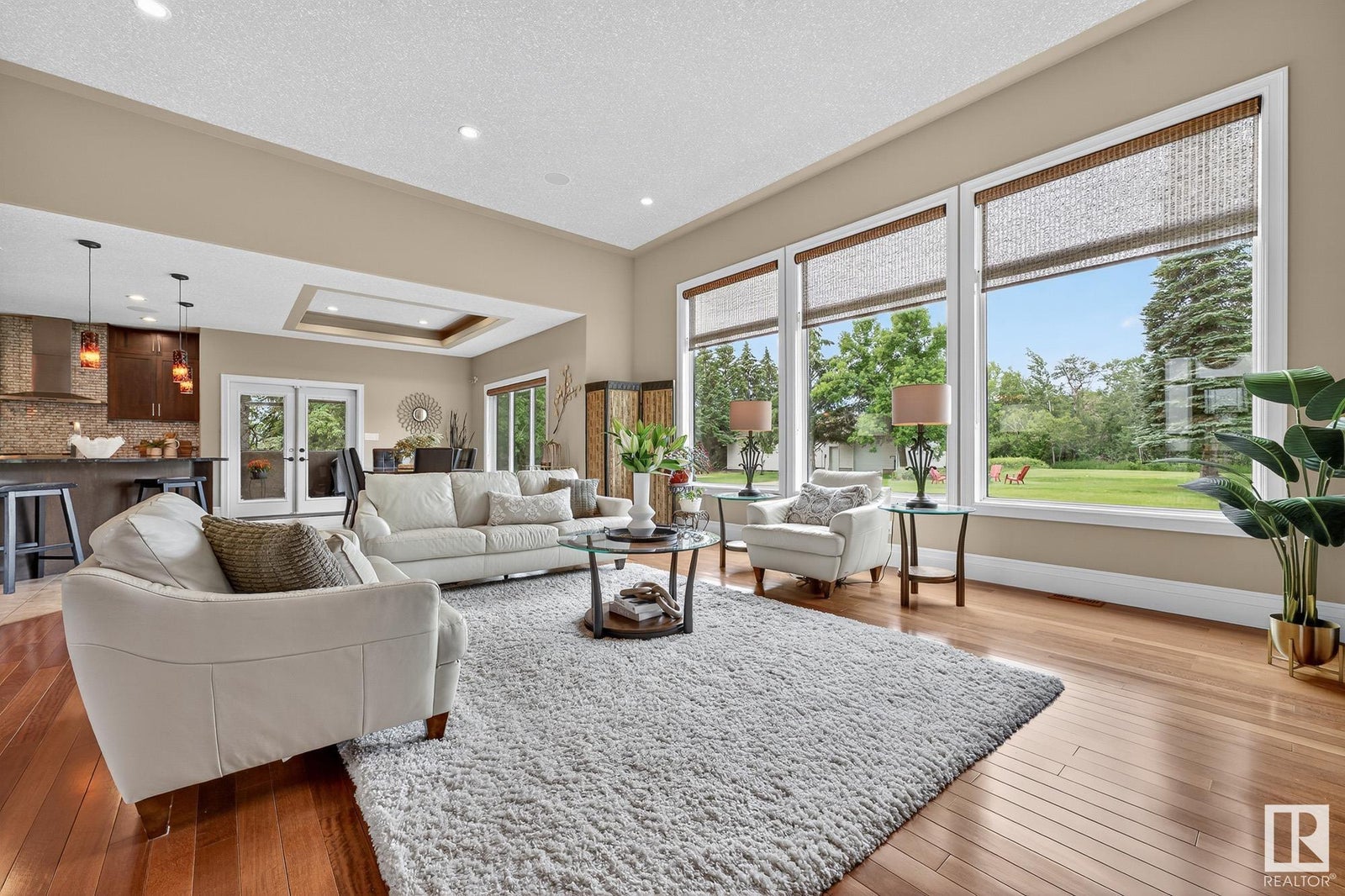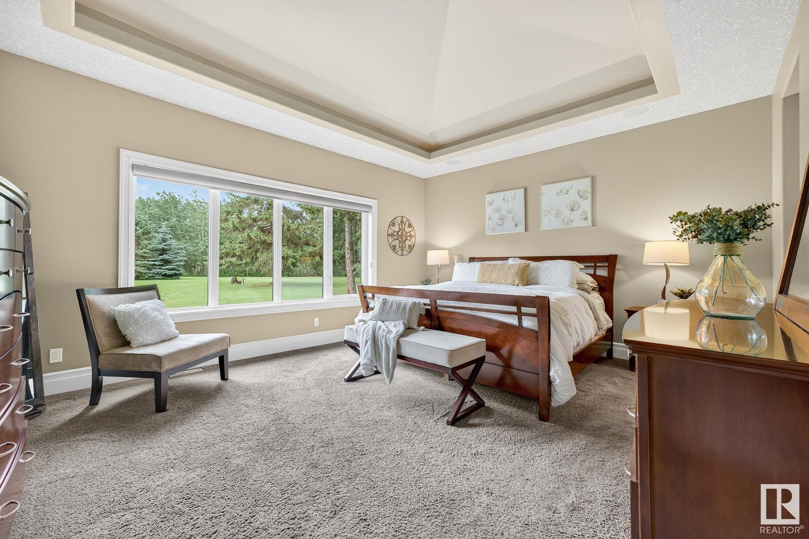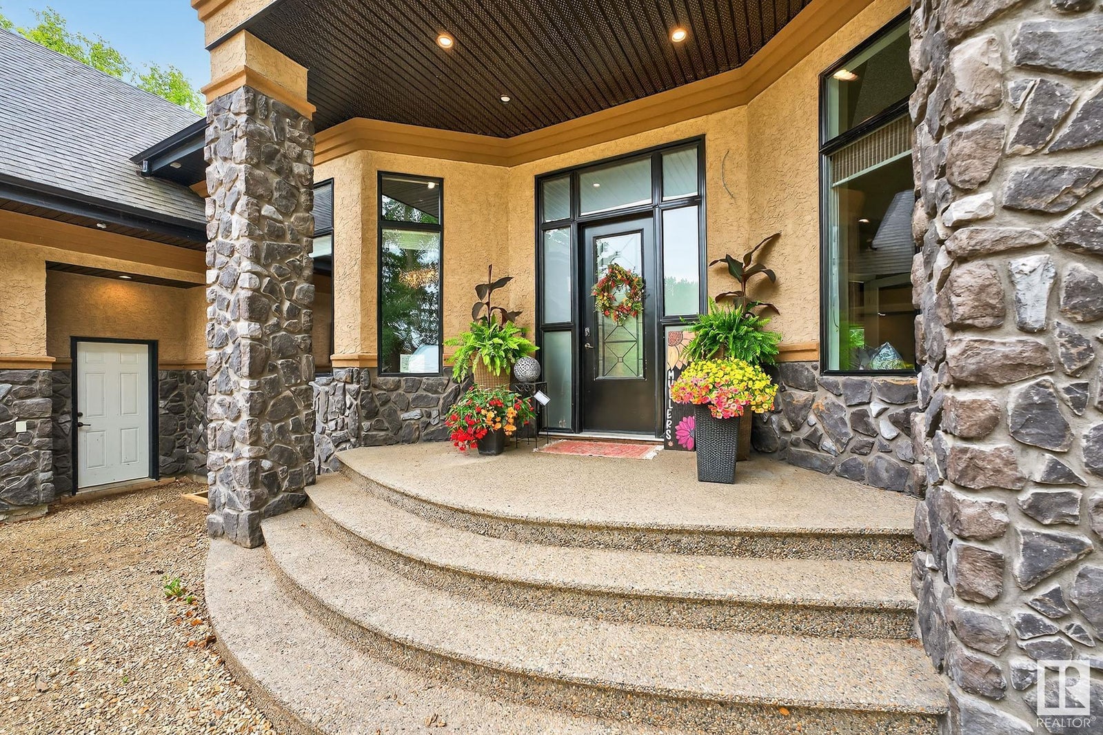 Welcome to Namao Ridge! This custom-built bungalow, situated on 1.67 acres, offers upscale living with unparalleled privacy. A dramatic curved staircase set against a stone feature wall, tray ceilings, and wall-to-wall windows elevate the open-concept main level. Enjoy a chef-inspired kitchen with rich cabinetry, granite countertops, and premium appliances, open to the living and dining areas, featuring a striking stone fireplace. The main floor includes the spacious primary suite, a second bedroom, and a formal dining room with architectural detailing. Downstairs features 3 bedrooms, a full bath, a half bath, a home gym, and a spacious rec room with room for a pool table. The show-stopping bar includes custom cabinetry, tile backsplash, and seating. A dedicated theatre room above the 4-car garage is perfect for movie nights. The 1,824sqft heated shop is finished with power, making it ideal for trades, storage, or your dream workspace. A covered patio and mature trees round out this exceptional property.