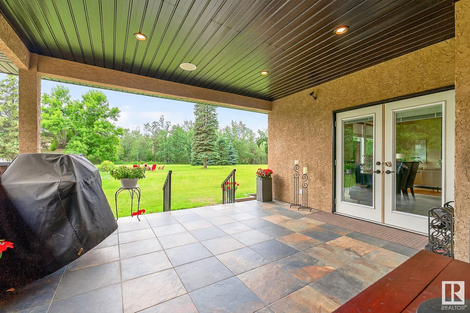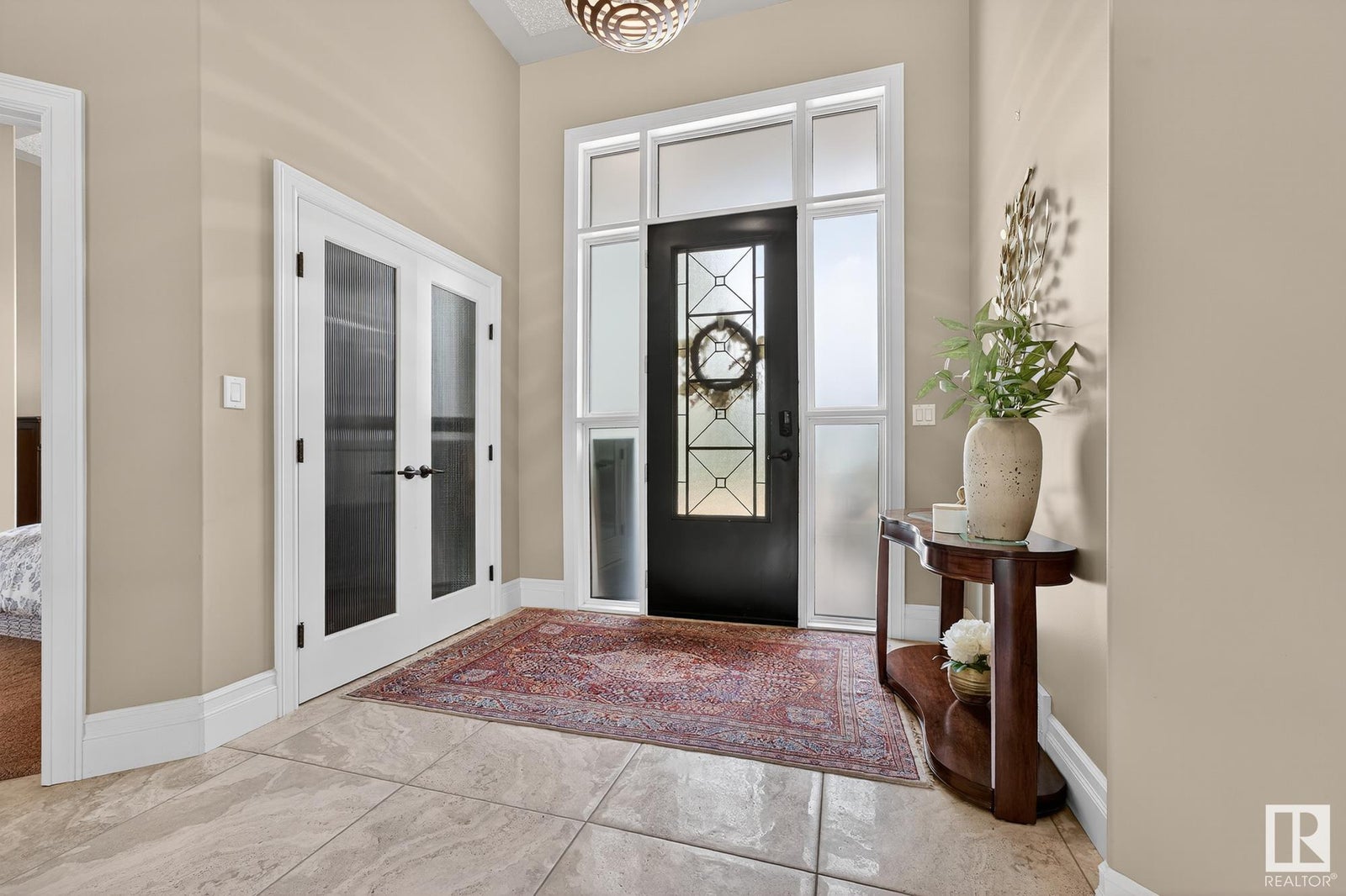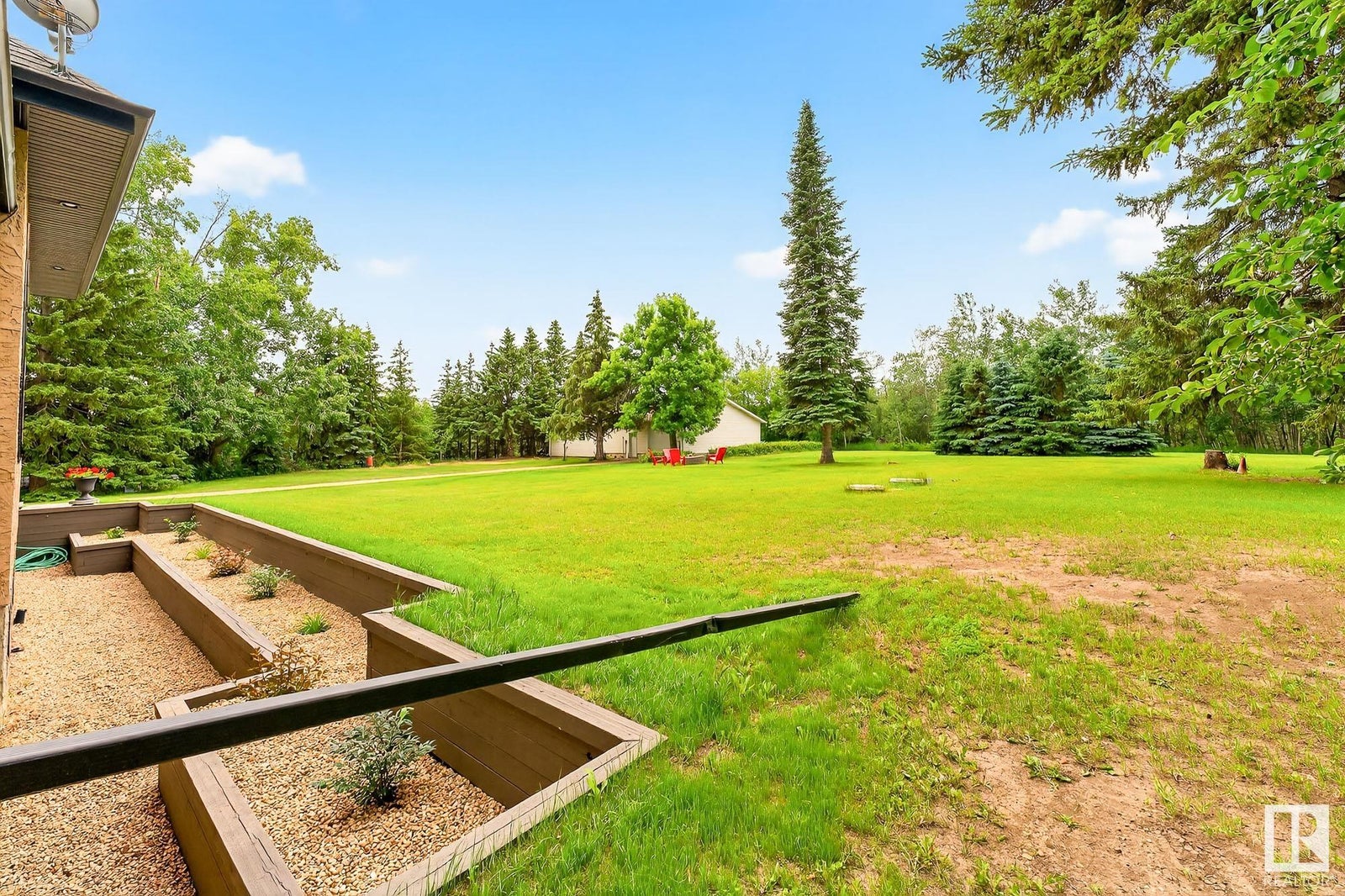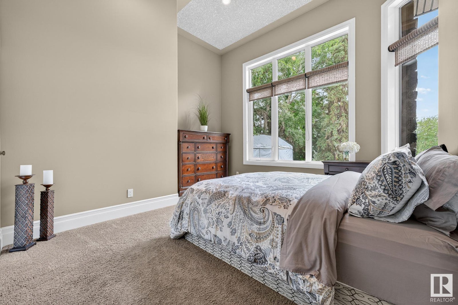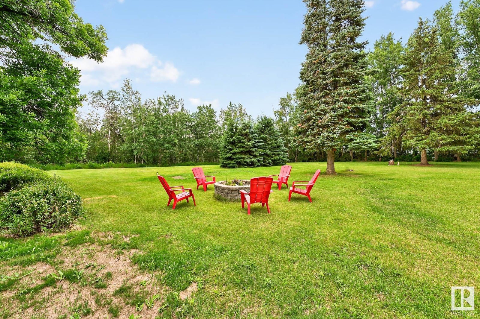 Welcome to Namao Ridge! This custom-built bungalow, situated on 1.67 acres, offers upscale living with unparalleled privacy. A dramatic curved staircase set against a stone feature wall, tray ceilings, and wall-to-wall windows elevate the open-concept main level. Enjoy a chef-inspired kitchen with rich cabinetry, granite countertops, and premium appliances, open to the living and dining areas, featuring a striking stone fireplace. The main floor includes the spacious primary suite, a second bedroom, and a formal dining room with architectural detailing. Downstairs features 3 bedrooms, a full bath, a half bath, a home gym, and a spacious rec room with room for a pool table. The show-stopping bar includes custom cabinetry, tile backsplash, and seating. A dedicated theatre room above the 4-car garage is perfect for movie nights. The 1,824sqft heated shop is finished with power, making it ideal for trades, storage, or your dream workspace. A covered patio and mature trees round out this exceptional property.