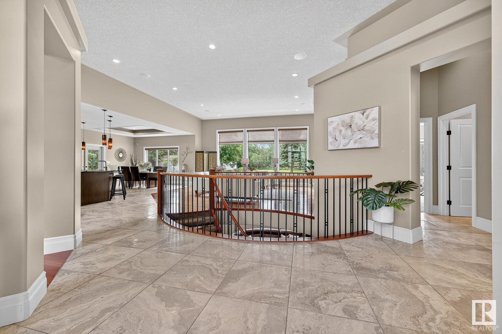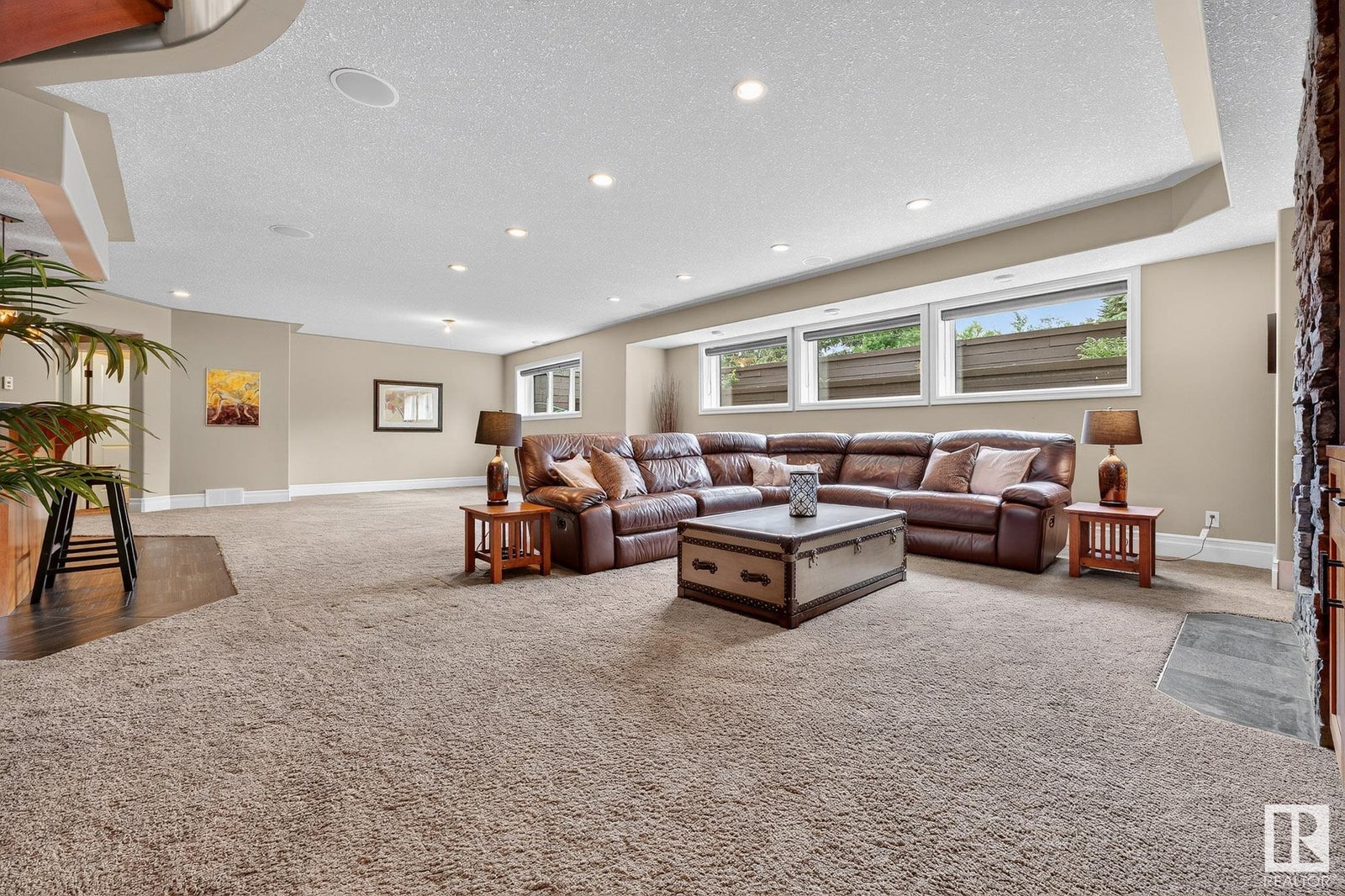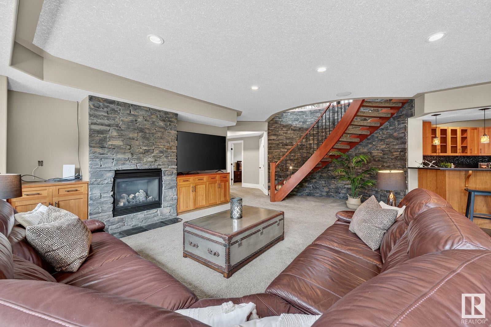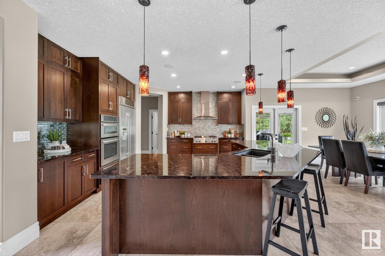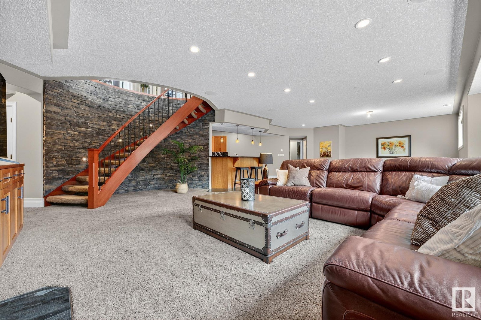 Welcome to Namao Ridge! This custom-built bungalow, situated on 1.67 acres, offers upscale living with unparalleled privacy. A dramatic curved staircase set against a stone feature wall, tray ceilings, and wall-to-wall windows elevate the open-concept main level. Enjoy a chef-inspired kitchen with rich cabinetry, granite countertops, and premium appliances, open to the living and dining areas, featuring a striking stone fireplace. The main floor includes the spacious primary suite, a second bedroom, and a formal dining room with architectural detailing. Downstairs features 3 bedrooms, a full bath, a half bath, a home gym, and a spacious rec room with room for a pool table. The show-stopping bar includes custom cabinetry, tile backsplash, and seating. A dedicated theatre room above the 4-car garage is perfect for movie nights. The 1,824sqft heated shop is finished with power, making it ideal for trades, storage, or your dream workspace. A covered patio and mature trees round out this exceptional property.