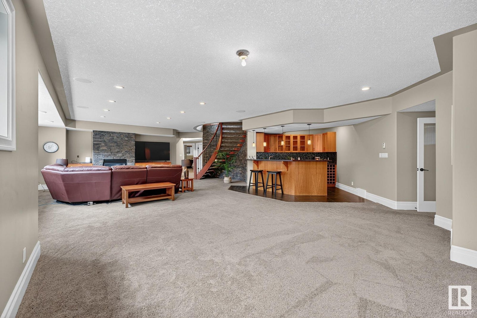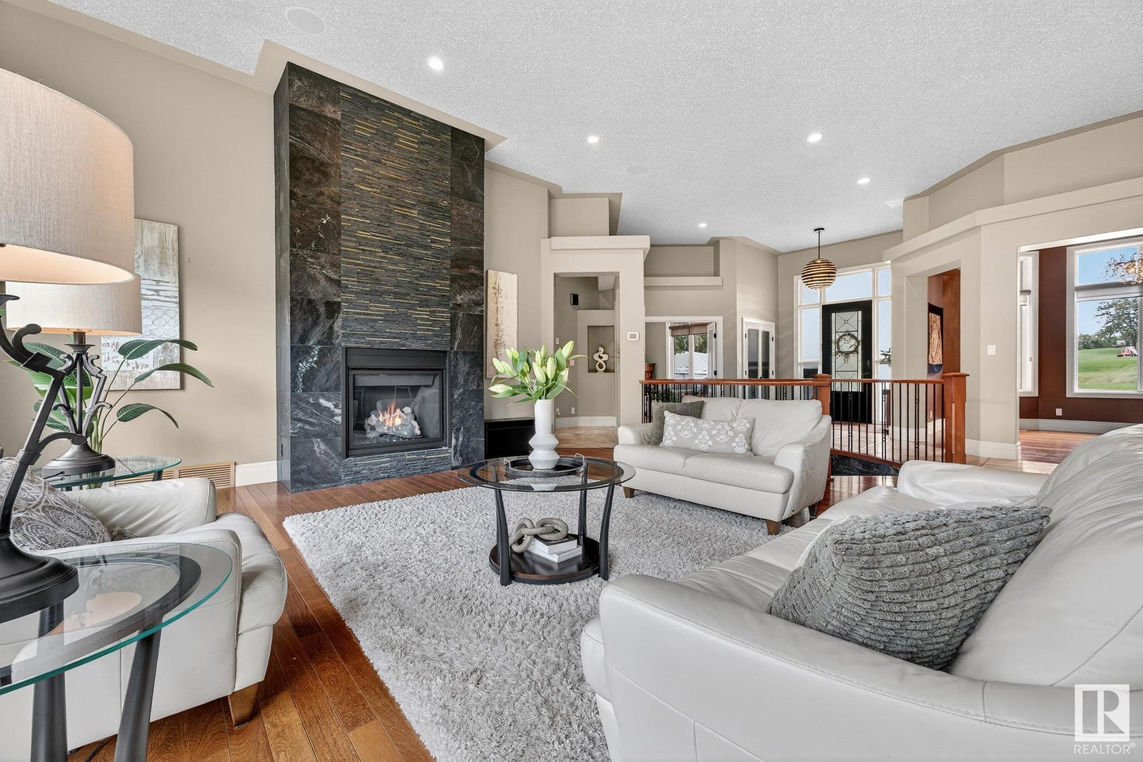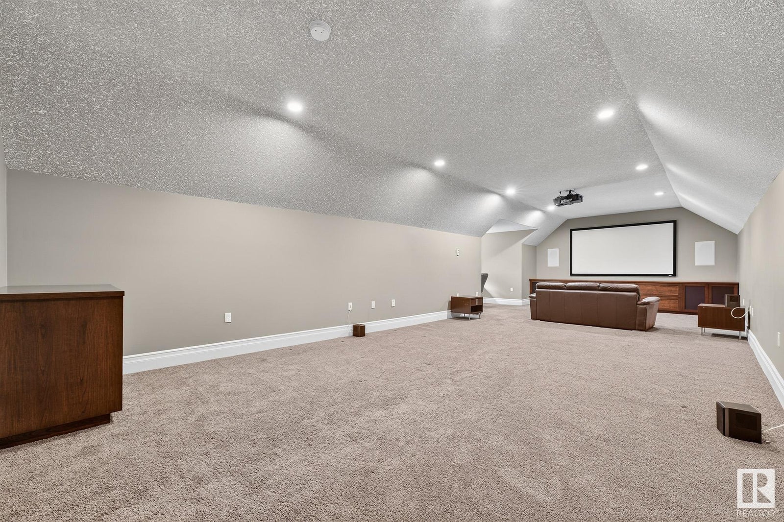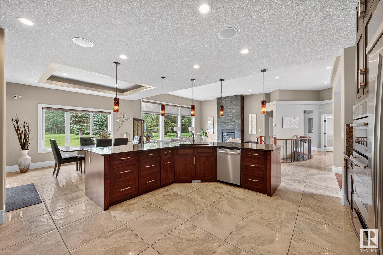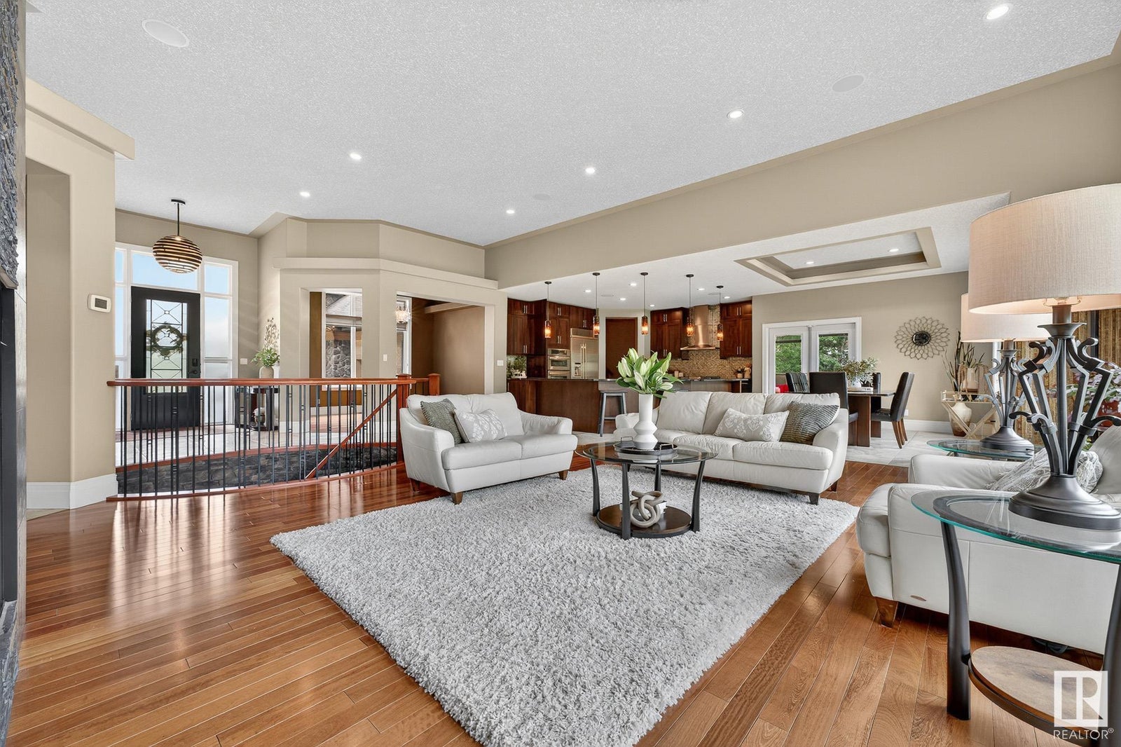 Welcome to Namao Ridge! This custom-built bungalow, situated on 1.67 acres, offers upscale living with unparalleled privacy. A dramatic curved staircase set against a stone feature wall, tray ceilings, and wall-to-wall windows elevate the open-concept main level. Enjoy a chef-inspired kitchen with rich cabinetry, granite countertops, and premium appliances, open to the living and dining areas, featuring a striking stone fireplace. The main floor includes the spacious primary suite, a second bedroom, and a formal dining room with architectural detailing. Downstairs features 3 bedrooms, a full bath, a half bath, a home gym, and a spacious rec room with room for a pool table. The show-stopping bar includes custom cabinetry, tile backsplash, and seating. A dedicated theatre room above the 4-car garage is perfect for movie nights. The 1,824sqft heated shop is finished with power, making it ideal for trades, storage, or your dream workspace. A covered patio and mature trees round out this exceptional property.