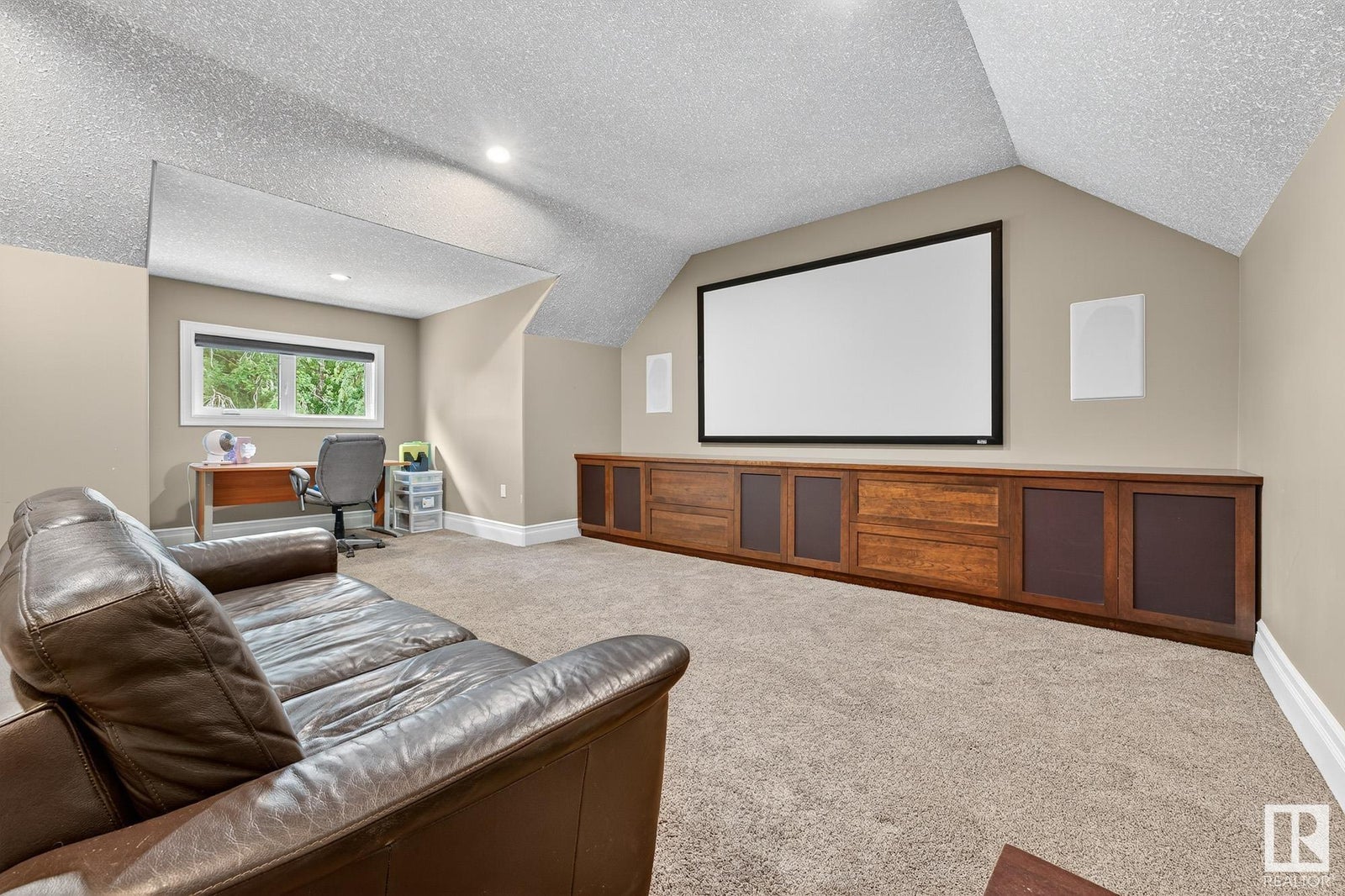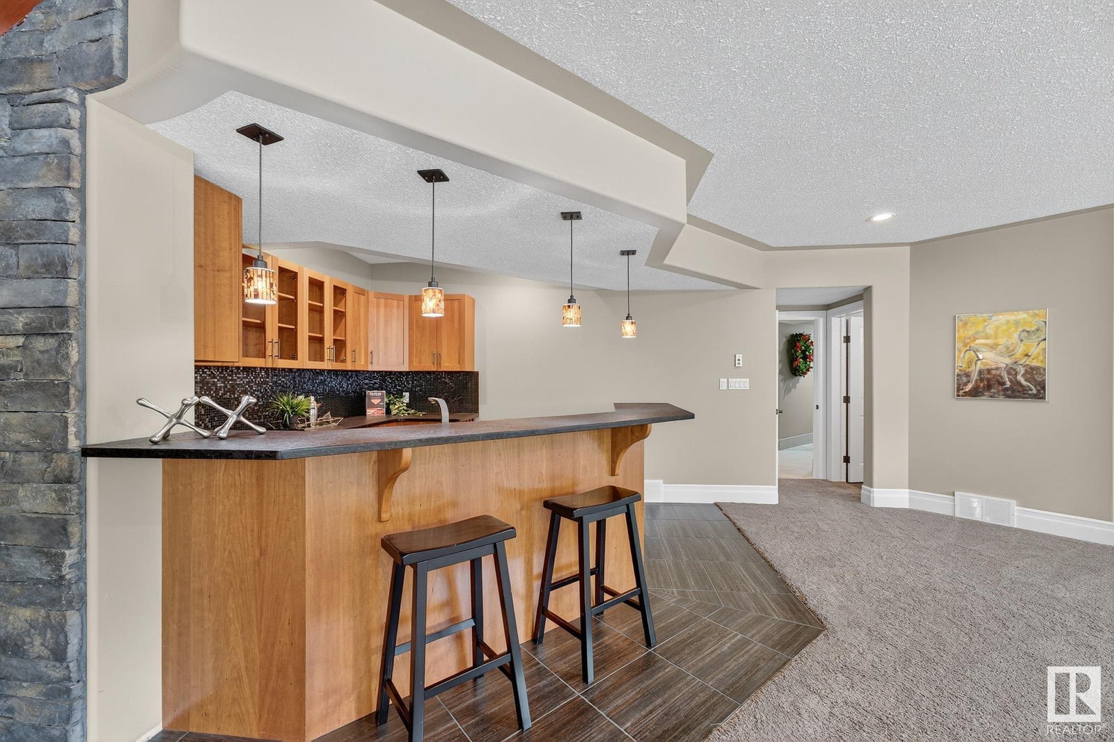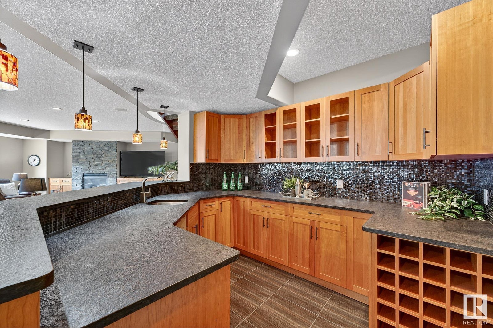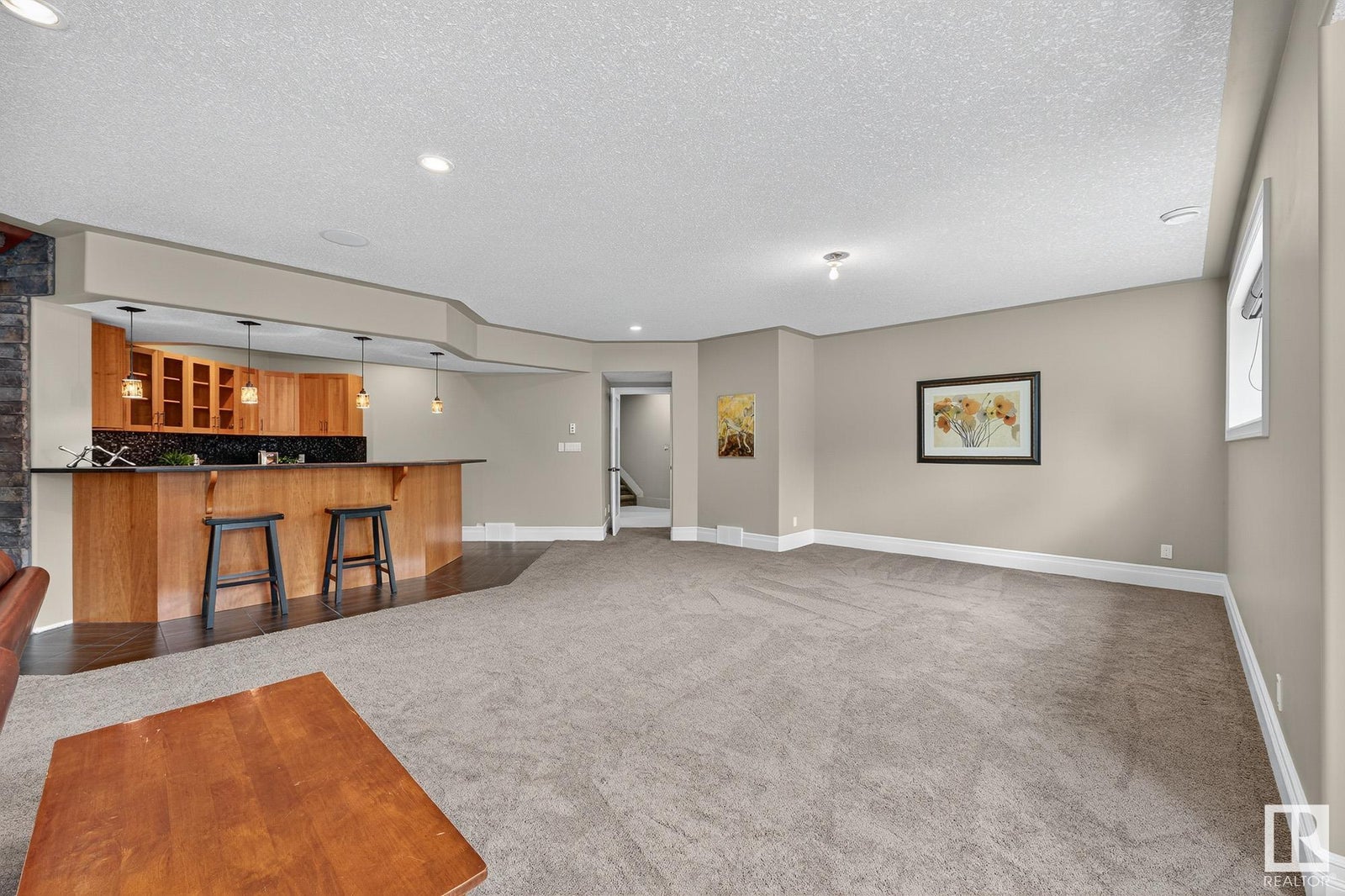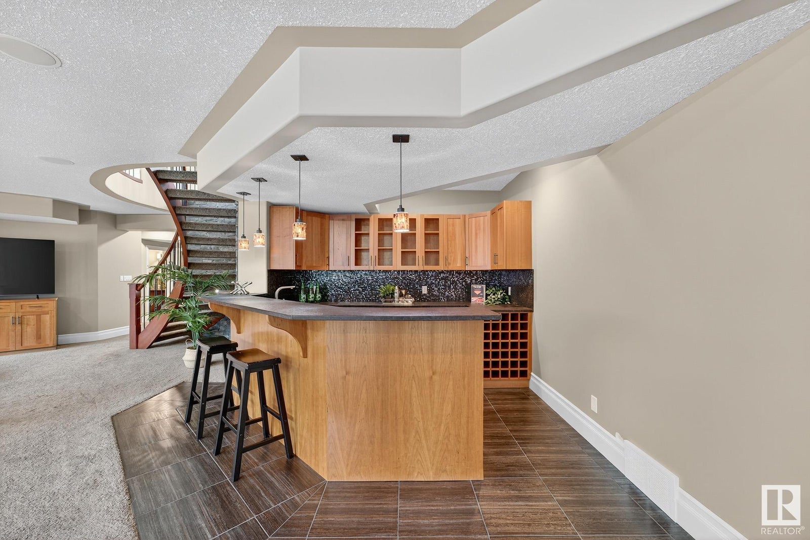 Welcome to Namao Ridge! This custom-built bungalow, situated on 1.67 acres, offers upscale living with unparalleled privacy. A dramatic curved staircase set against a stone feature wall, tray ceilings, and wall-to-wall windows elevate the open-concept main level. Enjoy a chef-inspired kitchen with rich cabinetry, granite countertops, and premium appliances, open to the living and dining areas, featuring a striking stone fireplace. The main floor includes the spacious primary suite, a second bedroom, and a formal dining room with architectural detailing. Downstairs features 3 bedrooms, a full bath, a half bath, a home gym, and a spacious rec room with room for a pool table. The show-stopping bar includes custom cabinetry, tile backsplash, and seating. A dedicated theatre room above the 4-car garage is perfect for movie nights. The 1,824sqft heated shop is finished with power, making it ideal for trades, storage, or your dream workspace. A covered patio and mature trees round out this exceptional property.