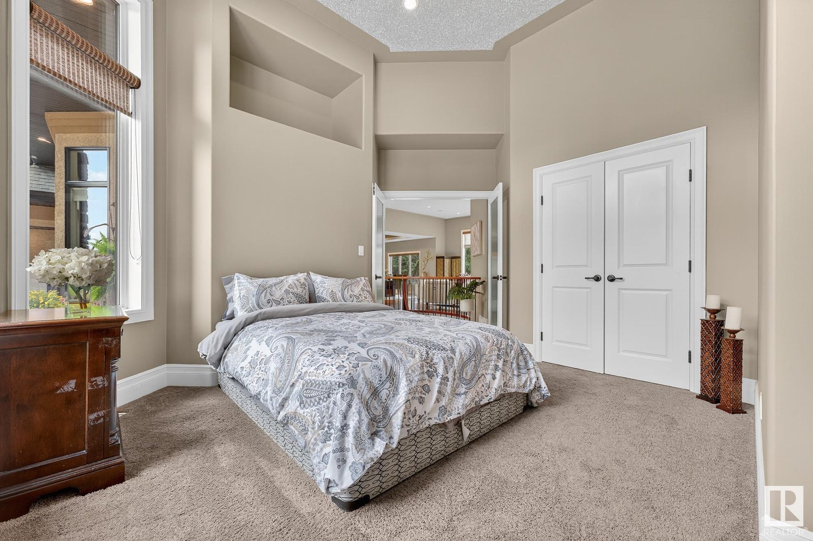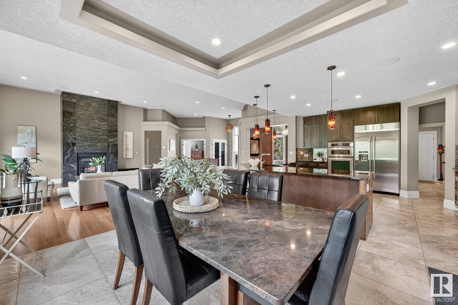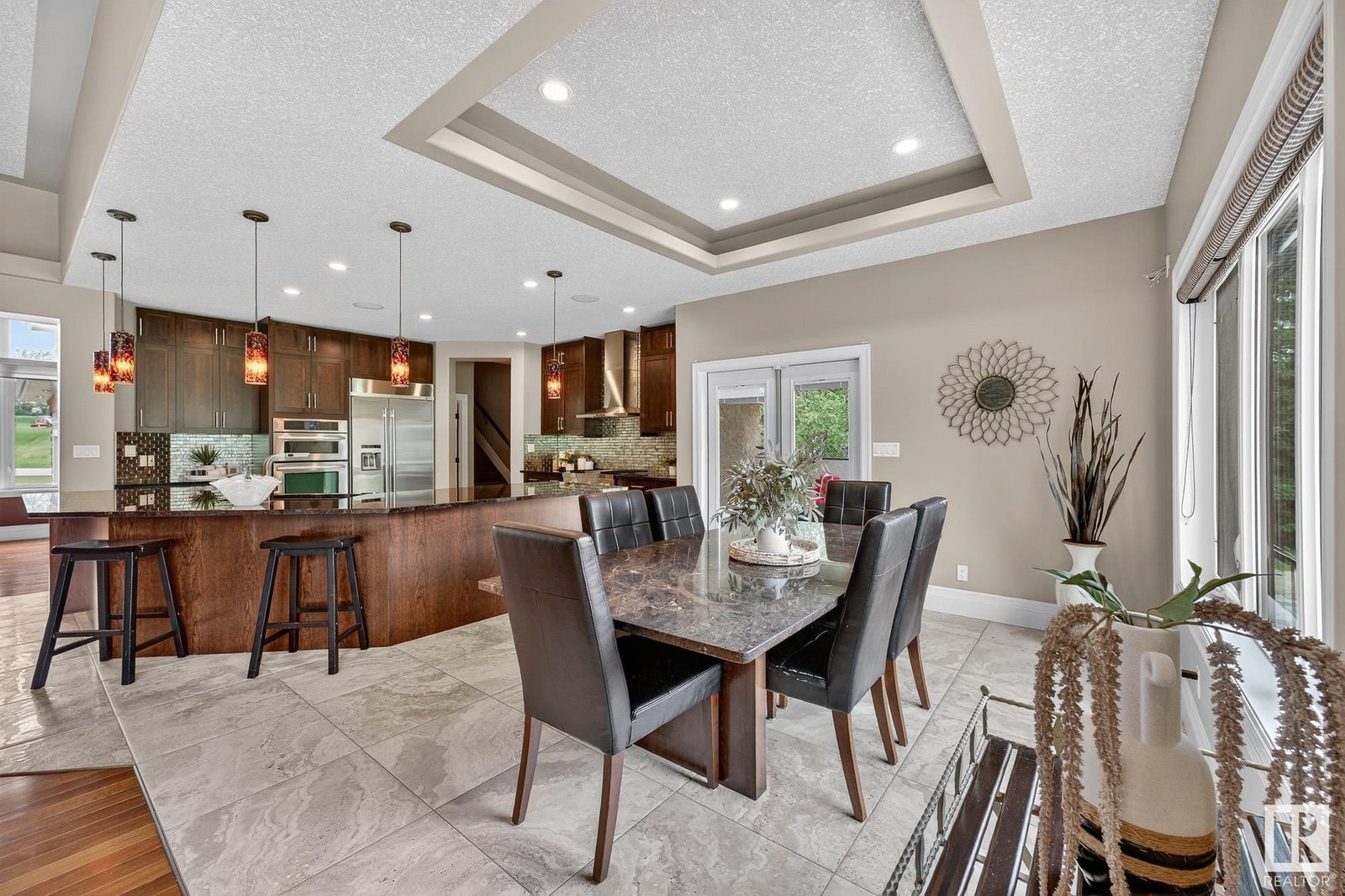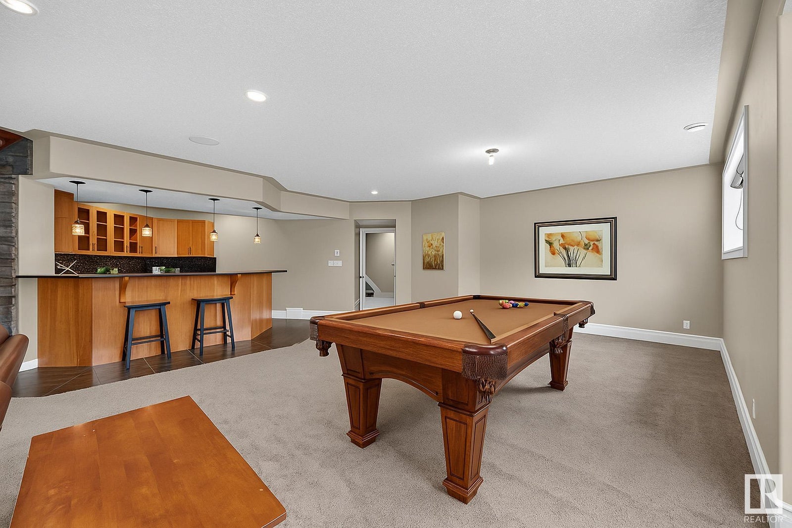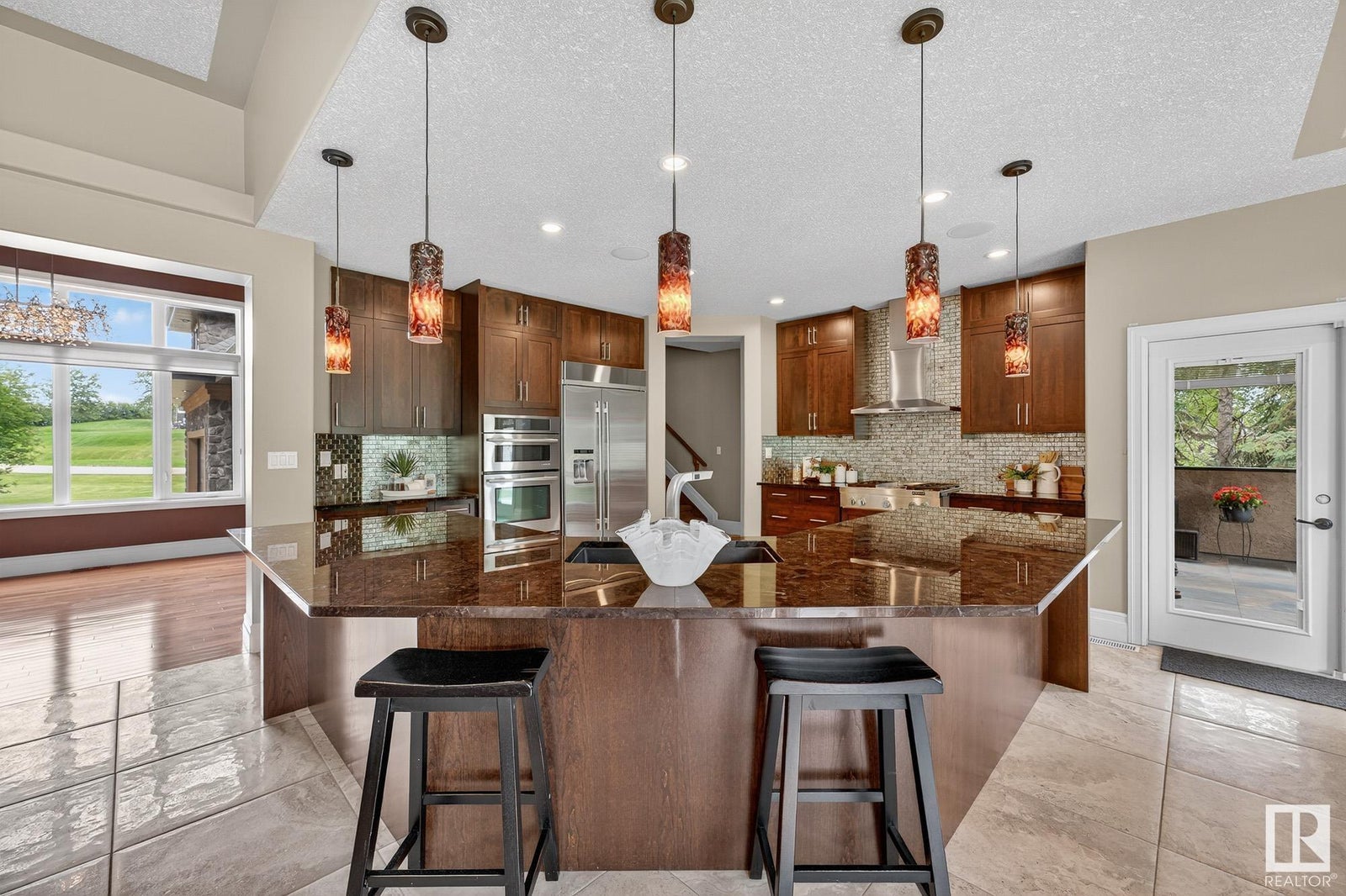 Welcome to Namao Ridge! This custom-built bungalow, situated on 1.67 acres, offers upscale living with unparalleled privacy. A dramatic curved staircase set against a stone feature wall, tray ceilings, and wall-to-wall windows elevate the open-concept main level. Enjoy a chef-inspired kitchen with rich cabinetry, granite countertops, and premium appliances, open to the living and dining areas, featuring a striking stone fireplace. The main floor includes the spacious primary suite, a second bedroom, and a formal dining room with architectural detailing. Downstairs features 3 bedrooms, a full bath, a half bath, a home gym, and a spacious rec room with room for a pool table. The show-stopping bar includes custom cabinetry, tile backsplash, and seating. A dedicated theatre room above the 4-car garage is perfect for movie nights. The 1,824sqft heated shop is finished with power, making it ideal for trades, storage, or your dream workspace. A covered patio and mature trees round out this exceptional property.