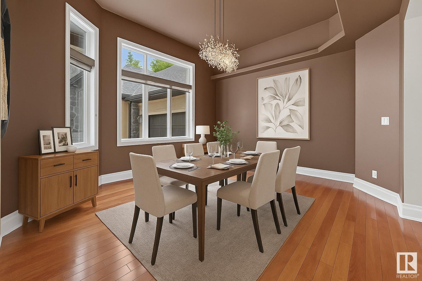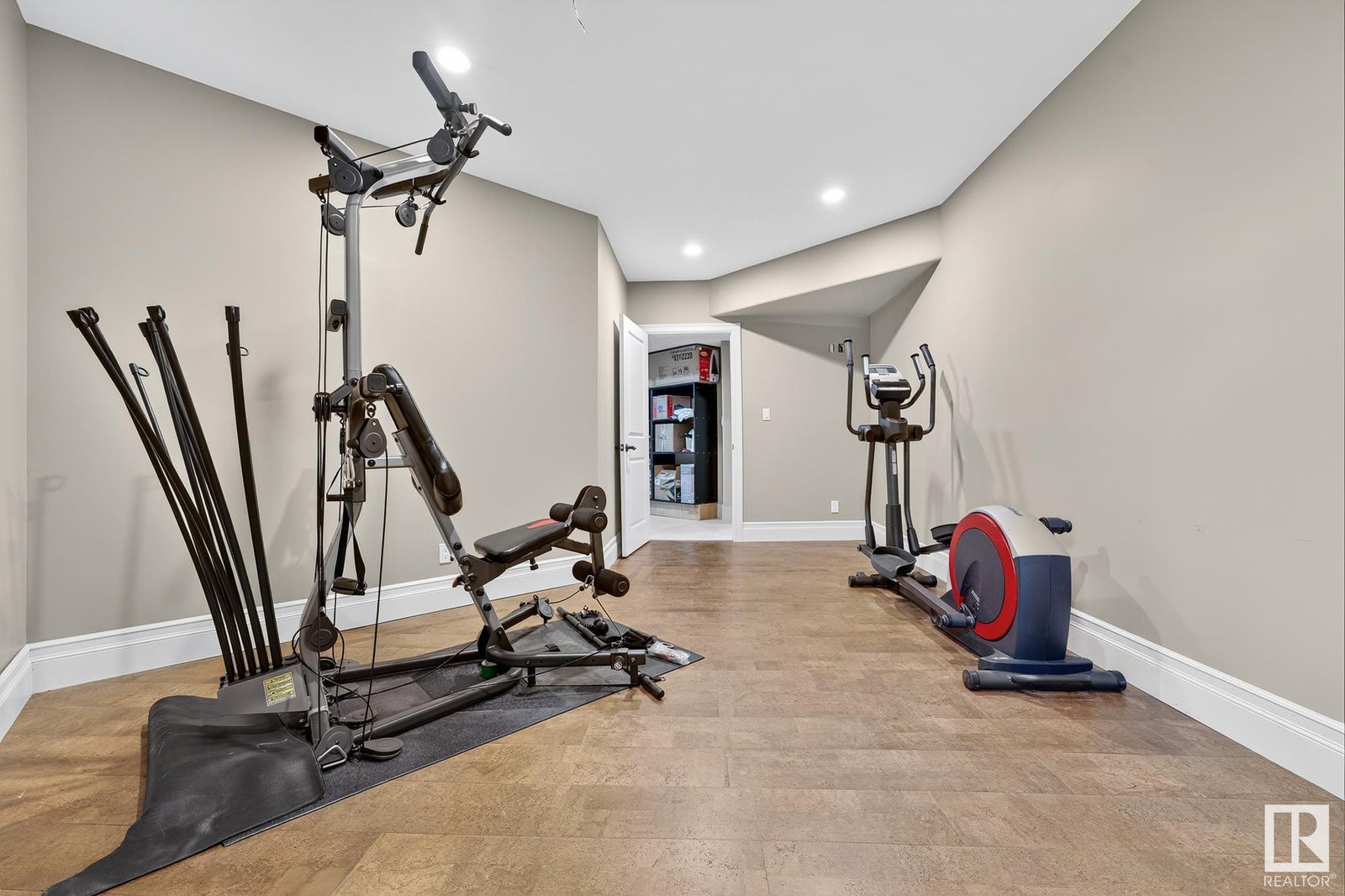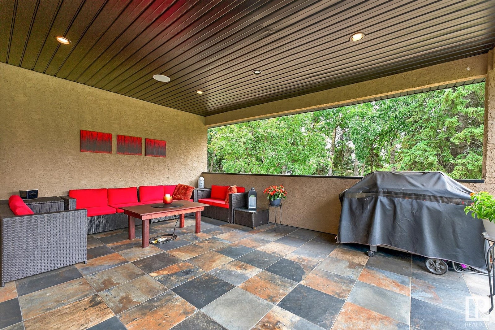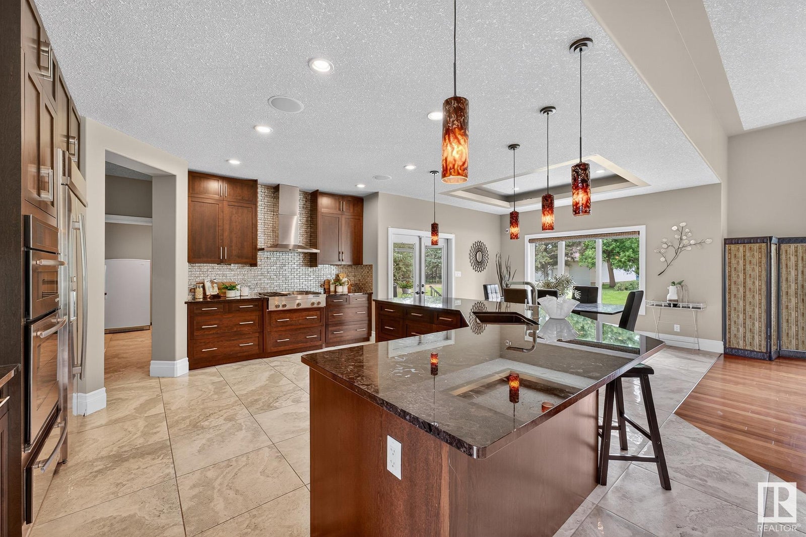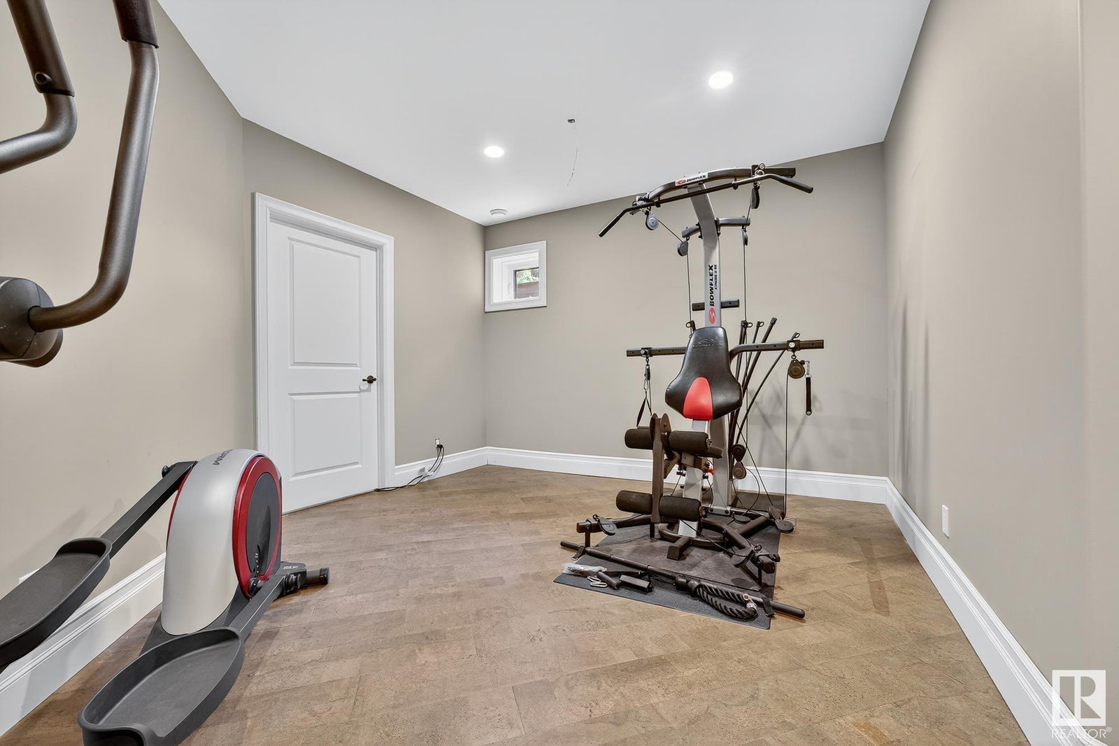 Welcome to Namao Ridge! This custom-built bungalow, situated on 1.67 acres, offers upscale living with unparalleled privacy. A dramatic curved staircase set against a stone feature wall, tray ceilings, and wall-to-wall windows elevate the open-concept main level. Enjoy a chef-inspired kitchen with rich cabinetry, granite countertops, and premium appliances, open to the living and dining areas, featuring a striking stone fireplace. The main floor includes the spacious primary suite, a second bedroom, and a formal dining room with architectural detailing. Downstairs features 3 bedrooms, a full bath, a half bath, a home gym, and a spacious rec room with room for a pool table. The show-stopping bar includes custom cabinetry, tile backsplash, and seating. A dedicated theatre room above the 4-car garage is perfect for movie nights. The 1,824sqft heated shop is finished with power, making it ideal for trades, storage, or your dream workspace. A covered patio and mature trees round out this exceptional property.