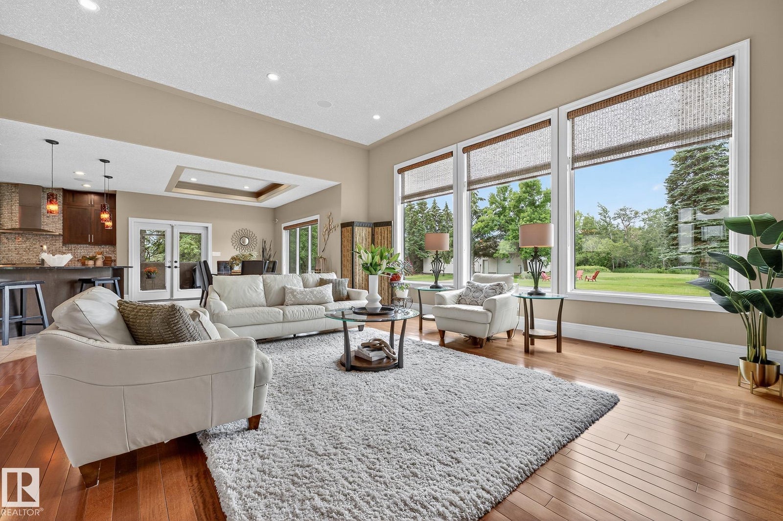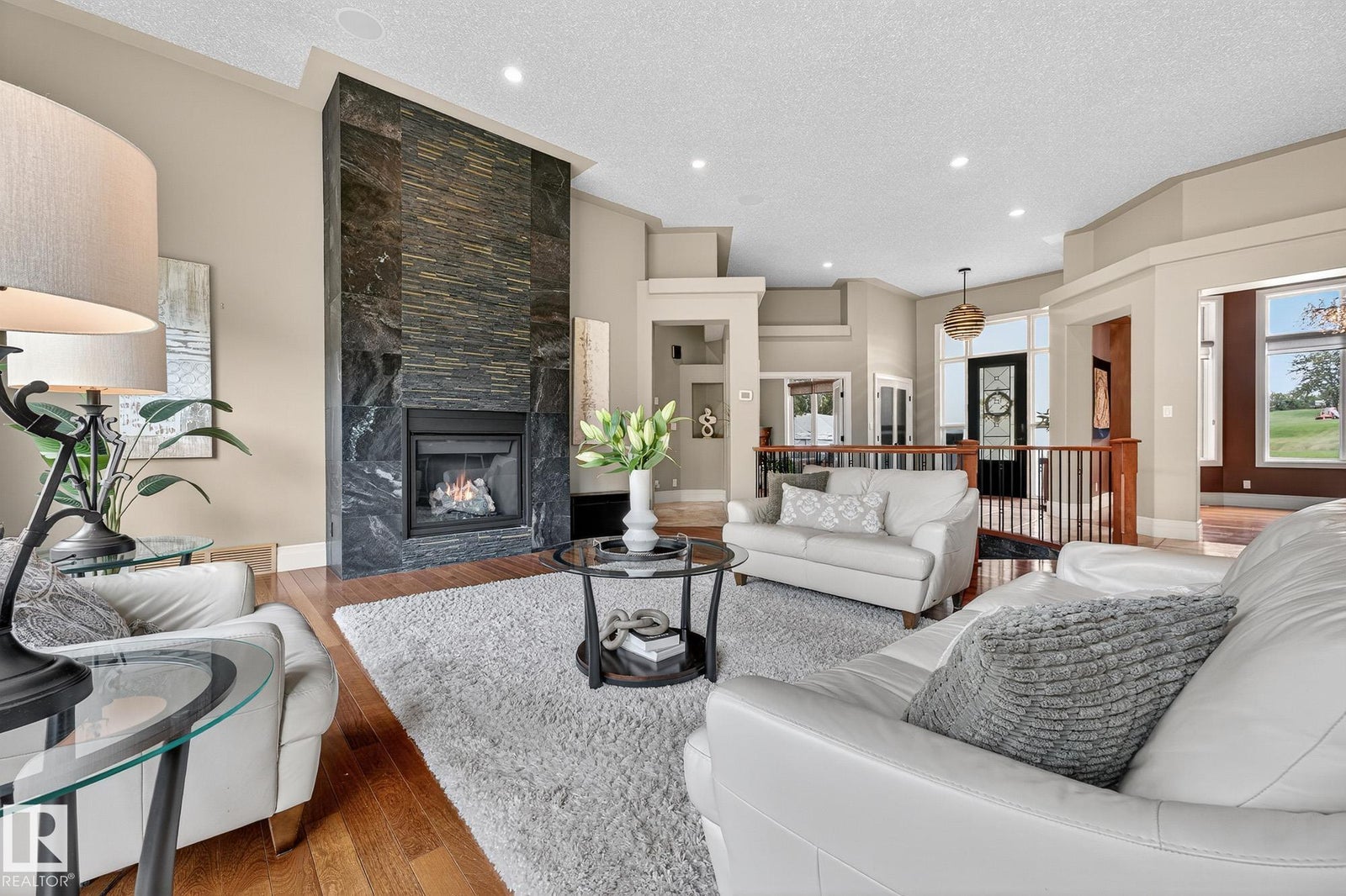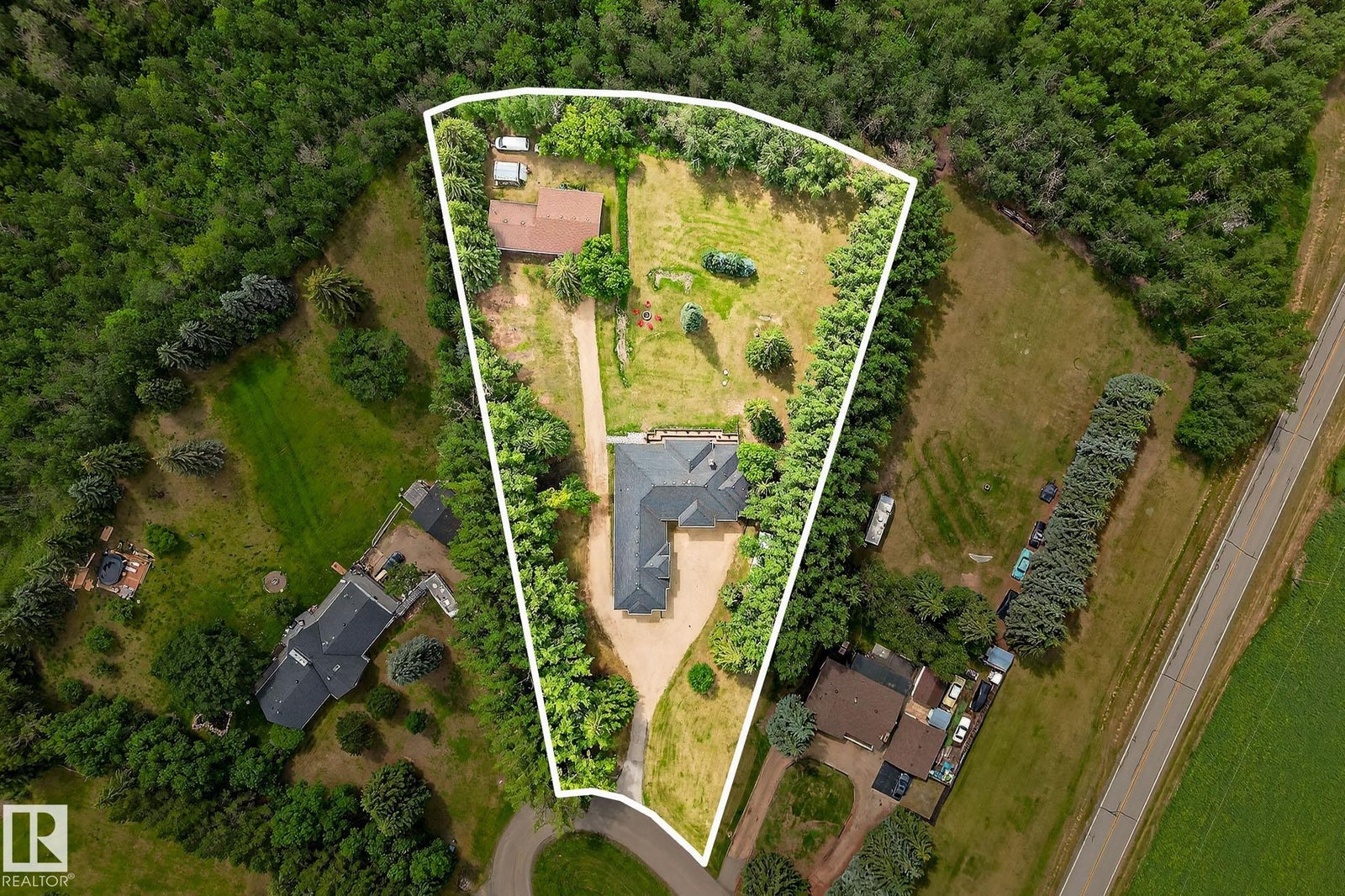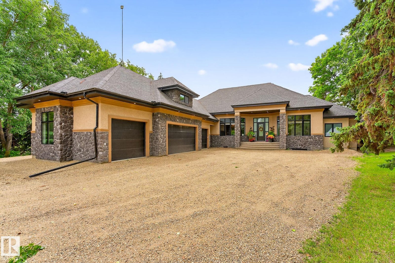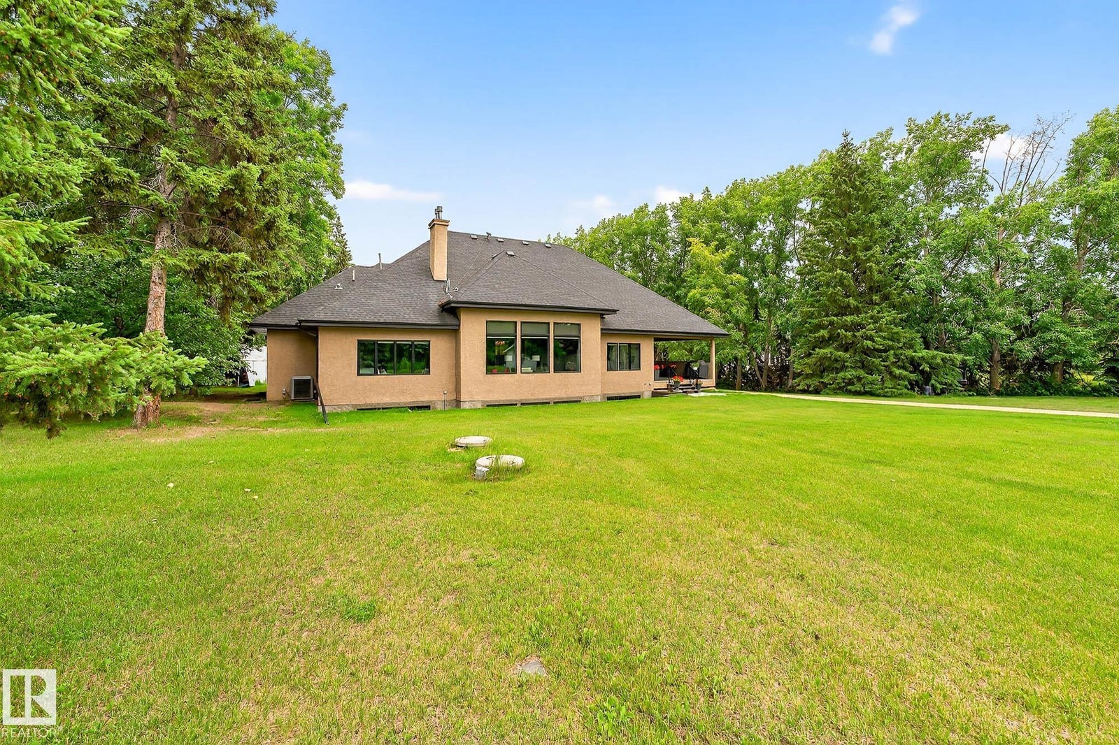 Welcome to Namao Ridge! This custom-built bungalow, situated on 1.67 acres, offers upscale living with unparalleled privacy. A dramatic curved staircase set against a stone feature wall, tray ceilings, and wall-to-wall windows elevate the open-concept main level. Enjoy a chef-inspired kitchen with rich cabinetry, granite countertops, and premium appliances, open to the living and dining areas, featuring a striking stone fireplace. The main floor includes the spacious primary suite, a second bedroom, and a formal dining room with architectural detailing. Downstairs features 3 bedrooms, a full bath, a half bath, a home gym, and a spacious rec room with room for a pool table. The show-stopping bar includes custom cabinetry, tile backsplash, and seating. A dedicated theatre room above the 4-car garage is perfect for movie nights. The 1,824sqft heated shop is finished with power, making it ideal for trades, storage, or your dream workspace. A covered patio and mature trees round out this exceptional property.