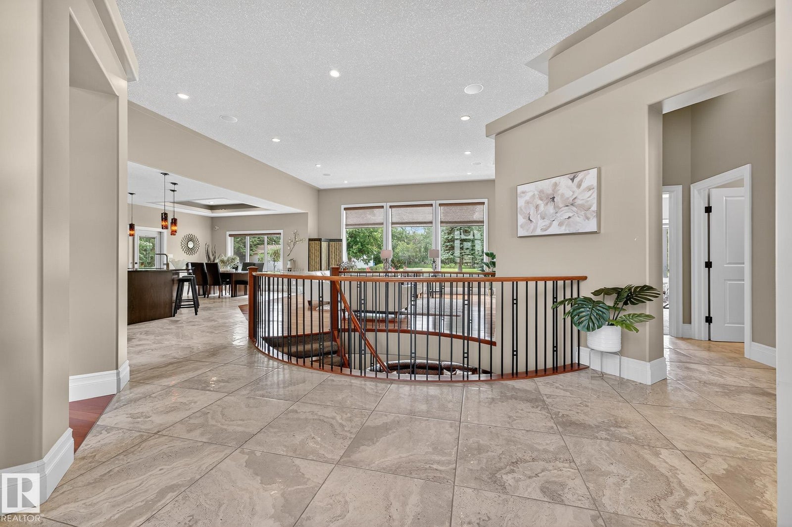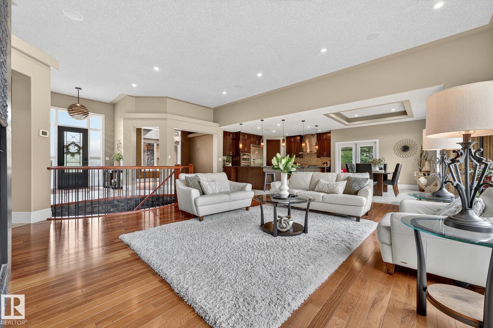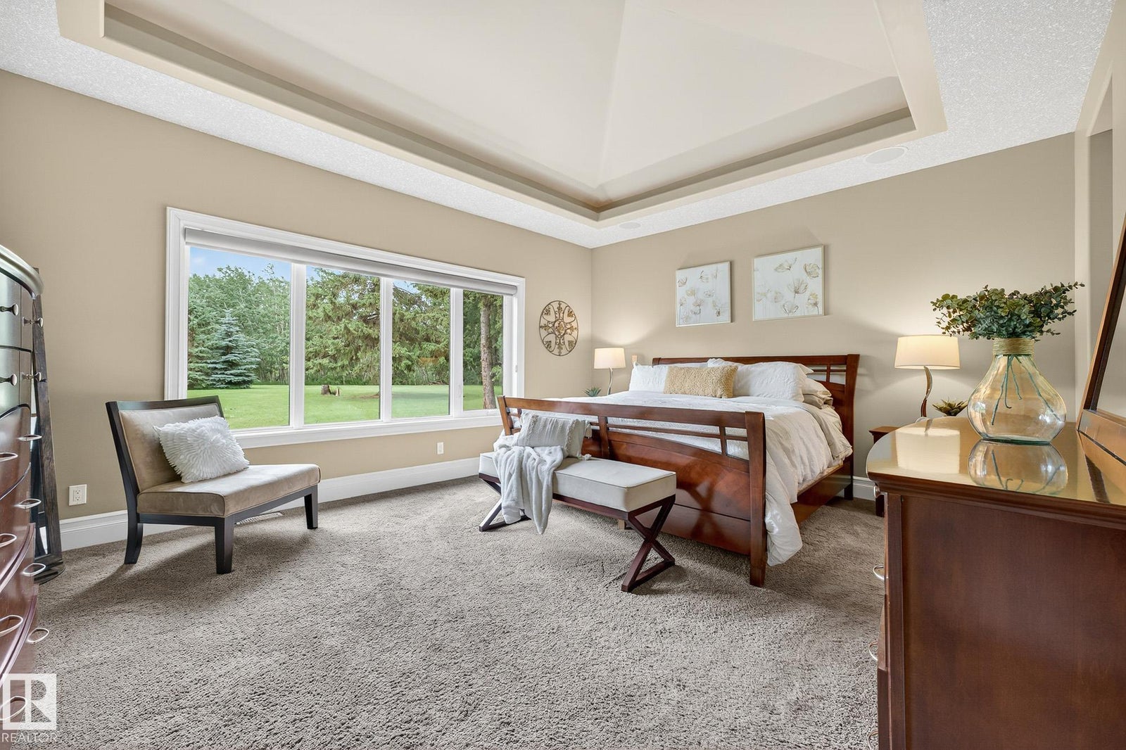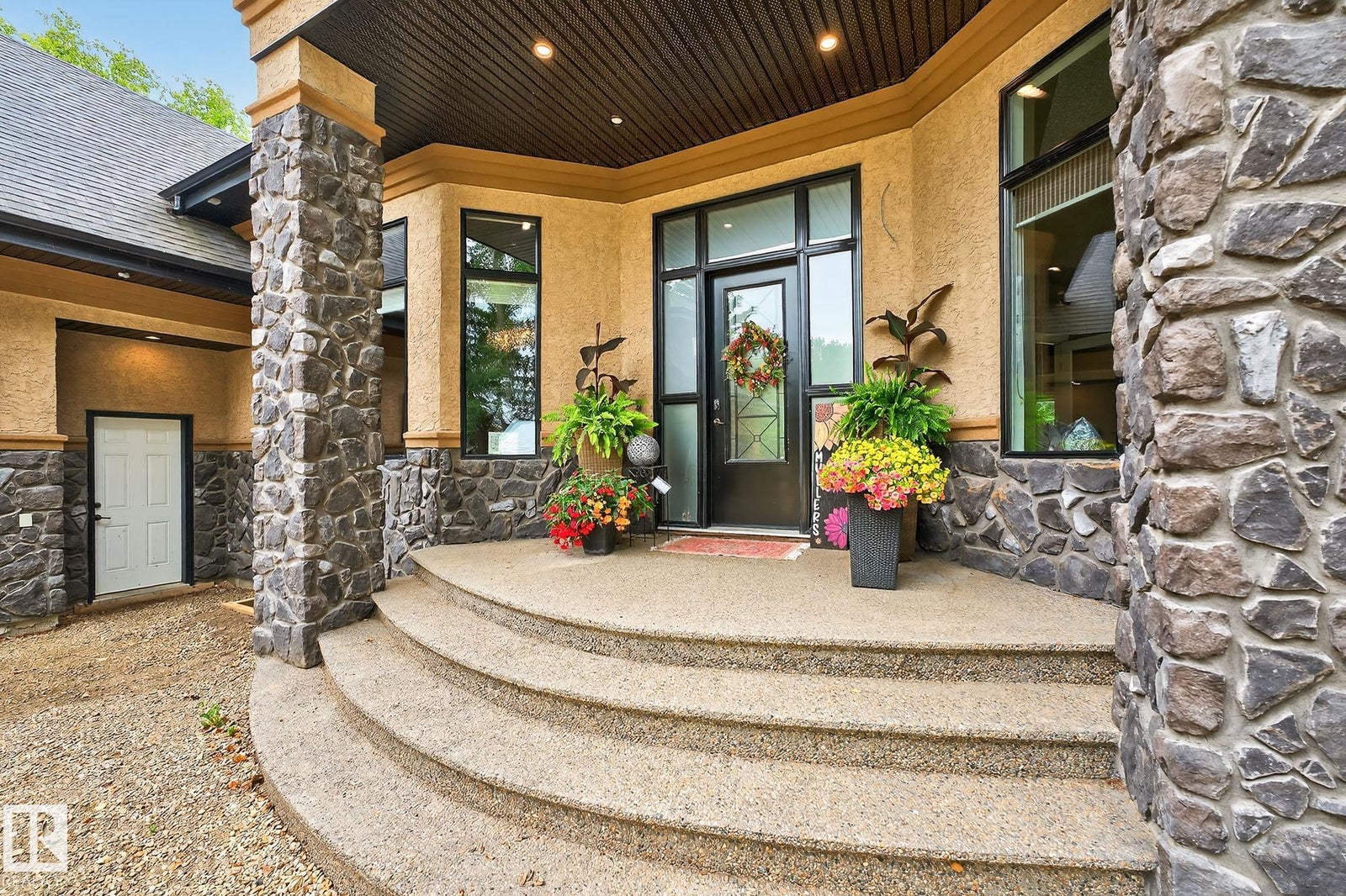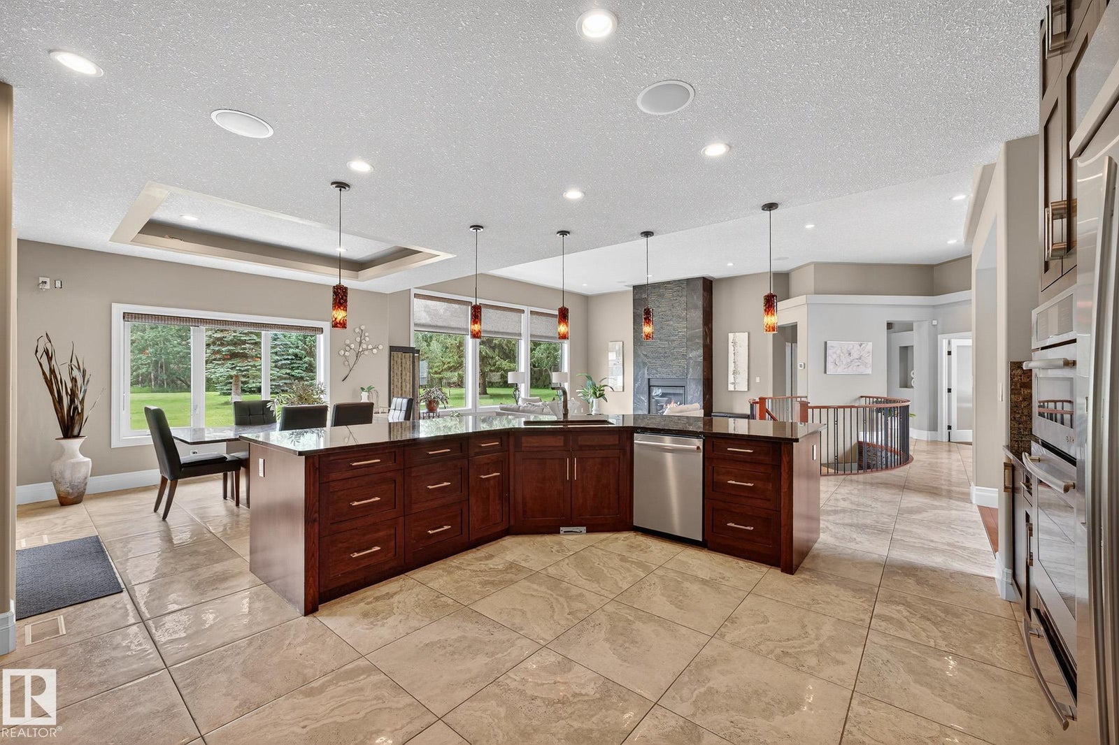 Welcome to Namao Ridge! This custom-built bungalow, situated on 1.67 acres, offers upscale living with unparalleled privacy. A dramatic curved staircase set against a stone feature wall, tray ceilings, and wall-to-wall windows elevate the open-concept main level. Enjoy a chef-inspired kitchen with rich cabinetry, granite countertops, and premium appliances, open to the living and dining areas, featuring a striking stone fireplace. The main floor includes the spacious primary suite, a second bedroom, and a formal dining room with architectural detailing. Downstairs features 3 bedrooms, a full bath, a half bath, a home gym, and a spacious rec room with room for a pool table. The show-stopping bar includes custom cabinetry, tile backsplash, and seating. A dedicated theatre room above the 4-car garage is perfect for movie nights. The 1,824sqft heated shop is finished with power, making it ideal for trades, storage, or your dream workspace. A covered patio and mature trees round out this exceptional property.