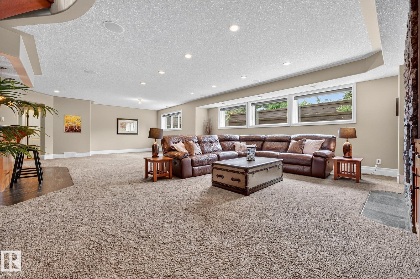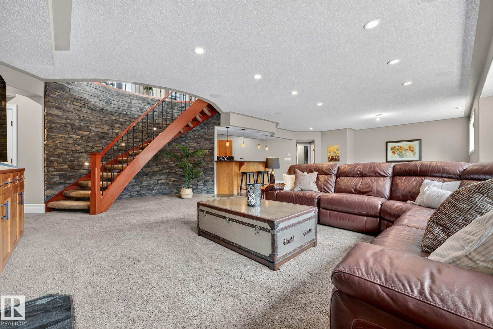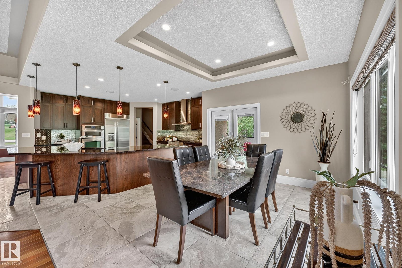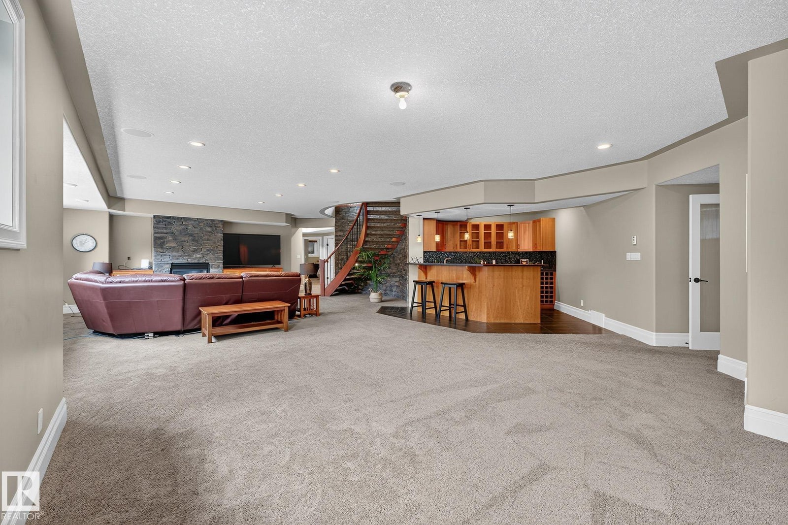 Welcome to Namao Ridge! This custom-built bungalow, situated on 1.67 acres, offers upscale living with unparalleled privacy. A dramatic curved staircase set against a stone feature wall, tray ceilings, and wall-to-wall windows elevate the open-concept main level. Enjoy a chef-inspired kitchen with rich cabinetry, granite countertops, and premium appliances, open to the living and dining areas, featuring a striking stone fireplace. The main floor includes the spacious primary suite, a second bedroom, and a formal dining room with architectural detailing. Downstairs features 3 bedrooms, a full bath, a half bath, a home gym, and a spacious rec room with room for a pool table. The show-stopping bar includes custom cabinetry, tile backsplash, and seating. A dedicated theatre room above the 4-car garage is perfect for movie nights. The 1,824sqft heated shop is finished with power, making it ideal for trades, storage, or your dream workspace. A covered patio and mature trees round out this exceptional property.