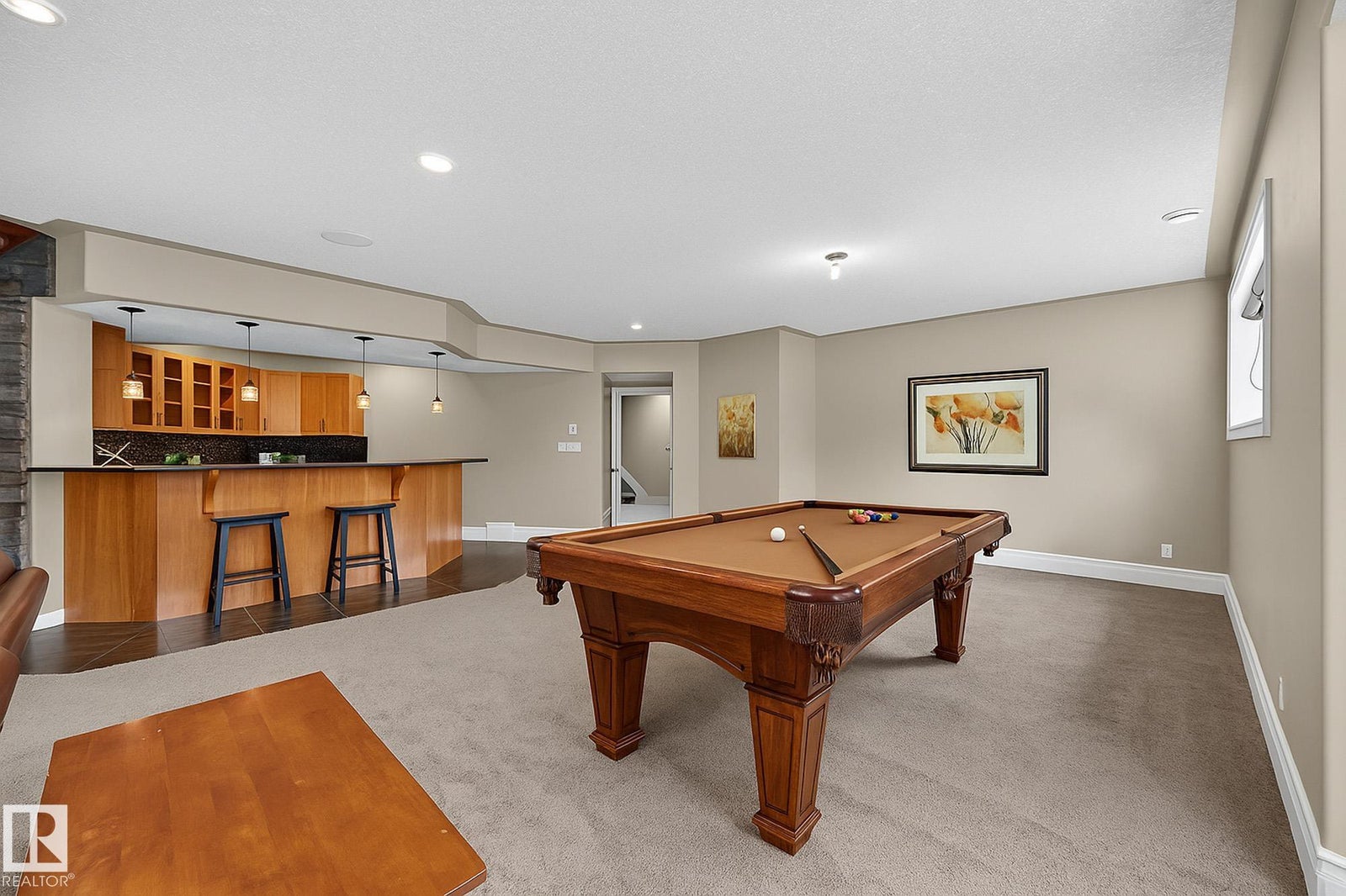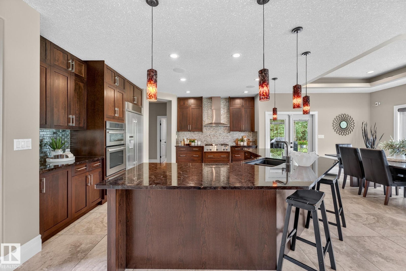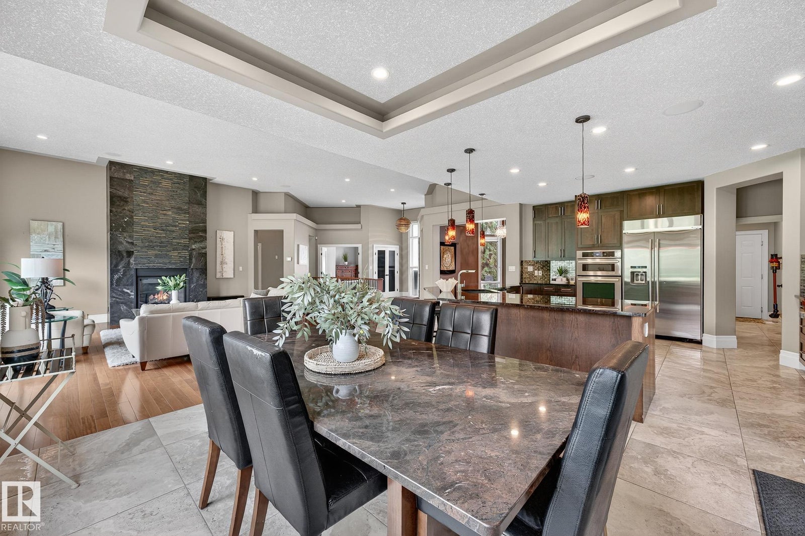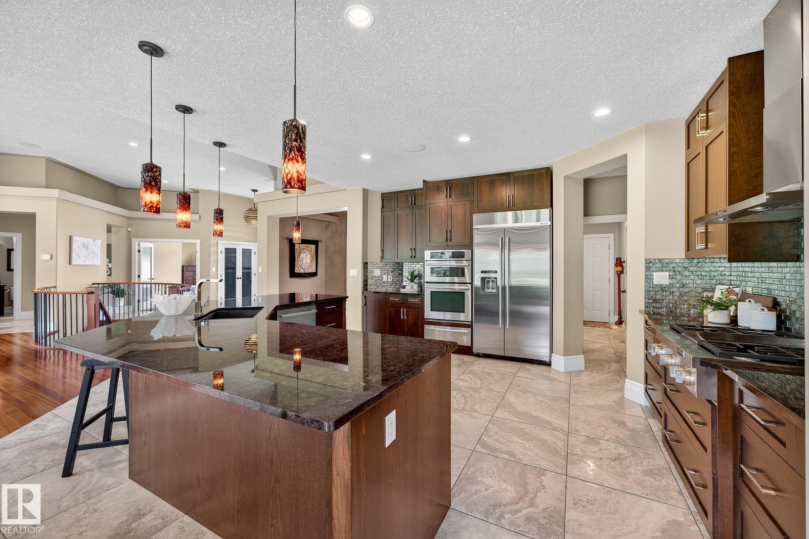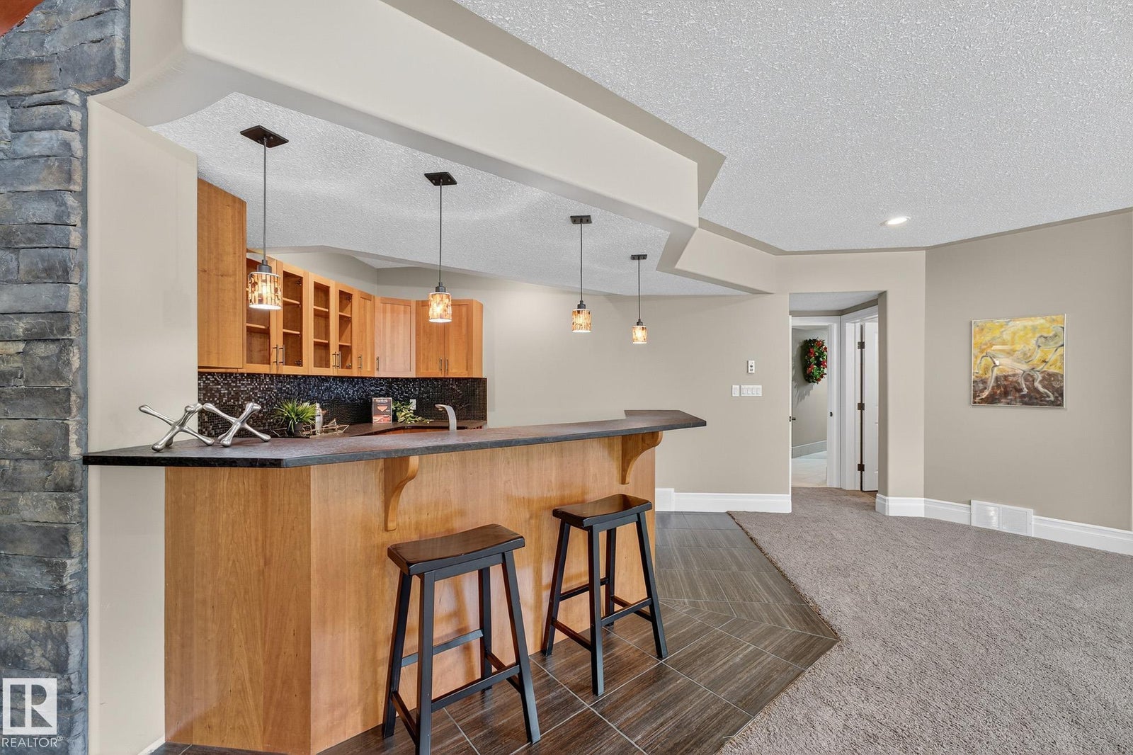 Welcome to Namao Ridge! This custom-built bungalow, situated on 1.67 acres, offers upscale living with unparalleled privacy. A dramatic curved staircase set against a stone feature wall, tray ceilings, and wall-to-wall windows elevate the open-concept main level. Enjoy a chef-inspired kitchen with rich cabinetry, granite countertops, and premium appliances, open to the living and dining areas, featuring a striking stone fireplace. The main floor includes the spacious primary suite, a second bedroom, and a formal dining room with architectural detailing. Downstairs features 3 bedrooms, a full bath, a half bath, a home gym, and a spacious rec room with room for a pool table. The show-stopping bar includes custom cabinetry, tile backsplash, and seating. A dedicated theatre room above the 4-car garage is perfect for movie nights. The 1,824sqft heated shop is finished with power, making it ideal for trades, storage, or your dream workspace. A covered patio and mature trees round out this exceptional property.