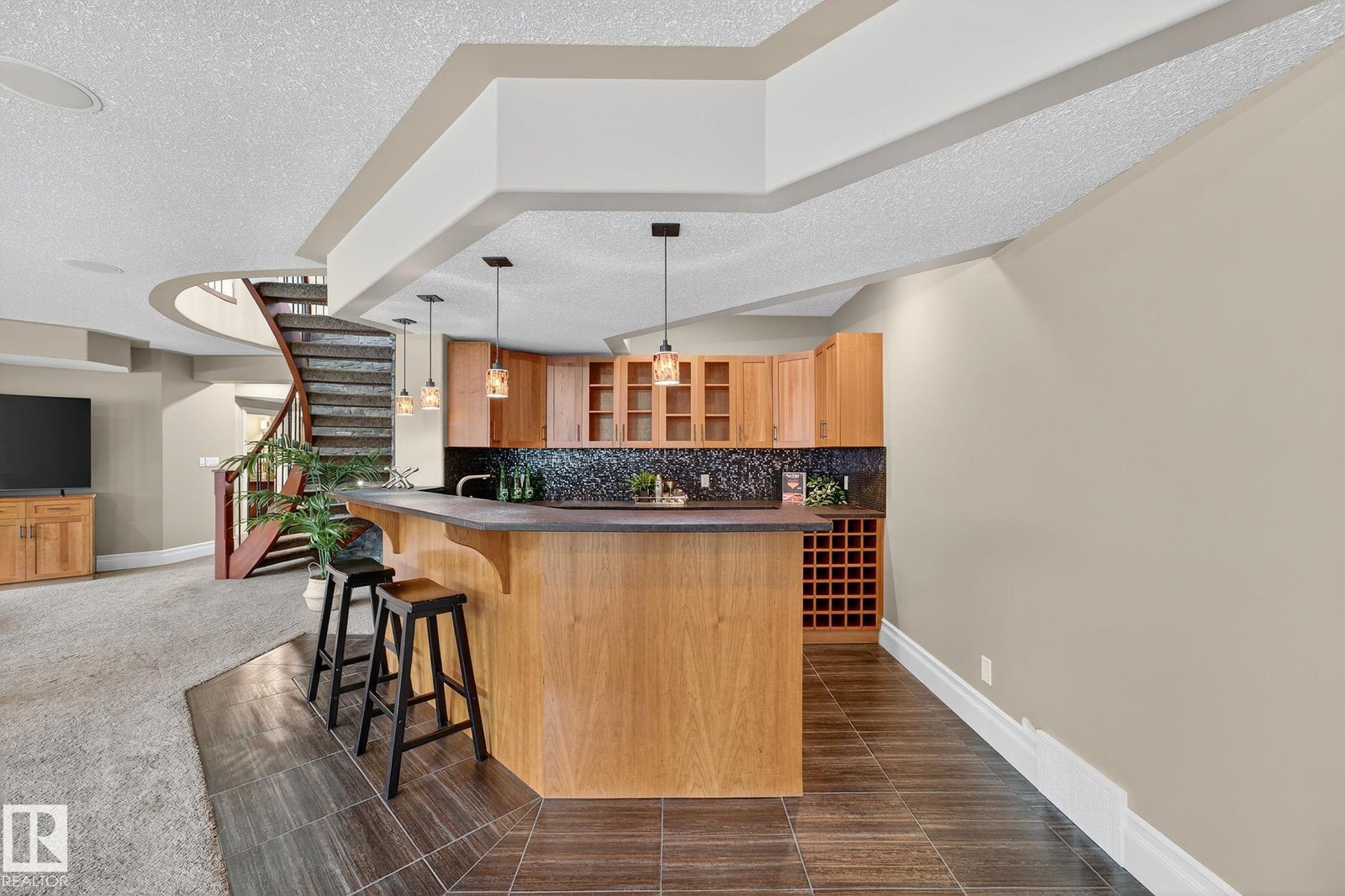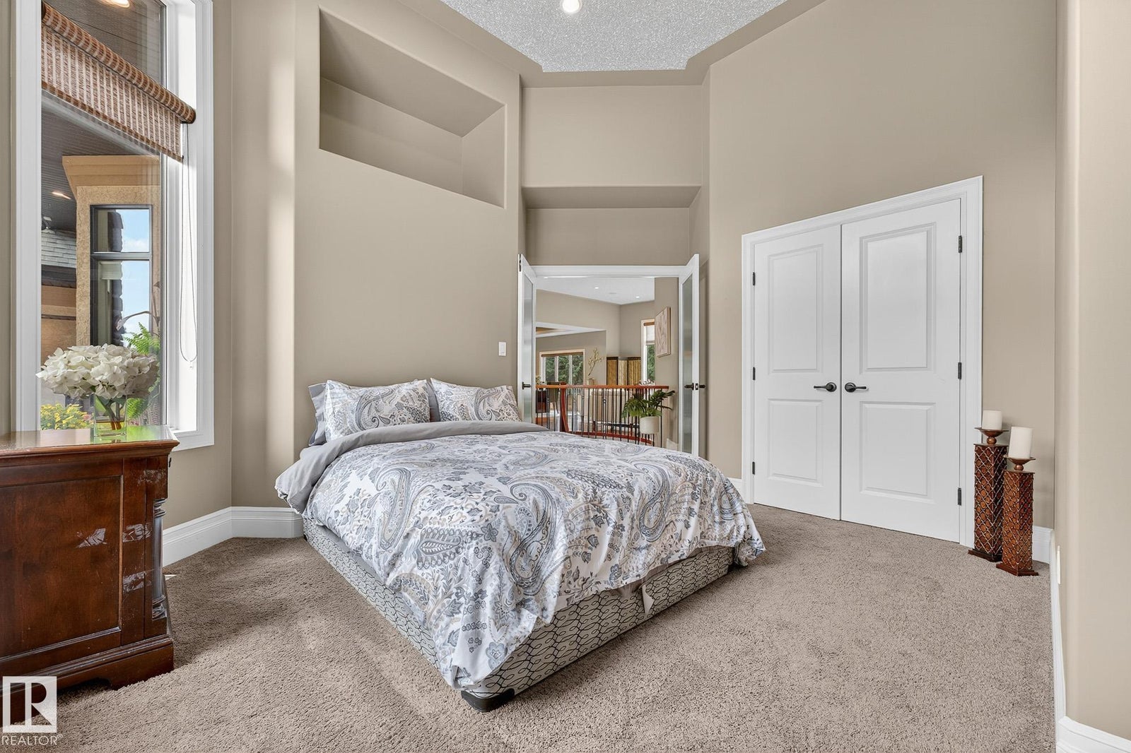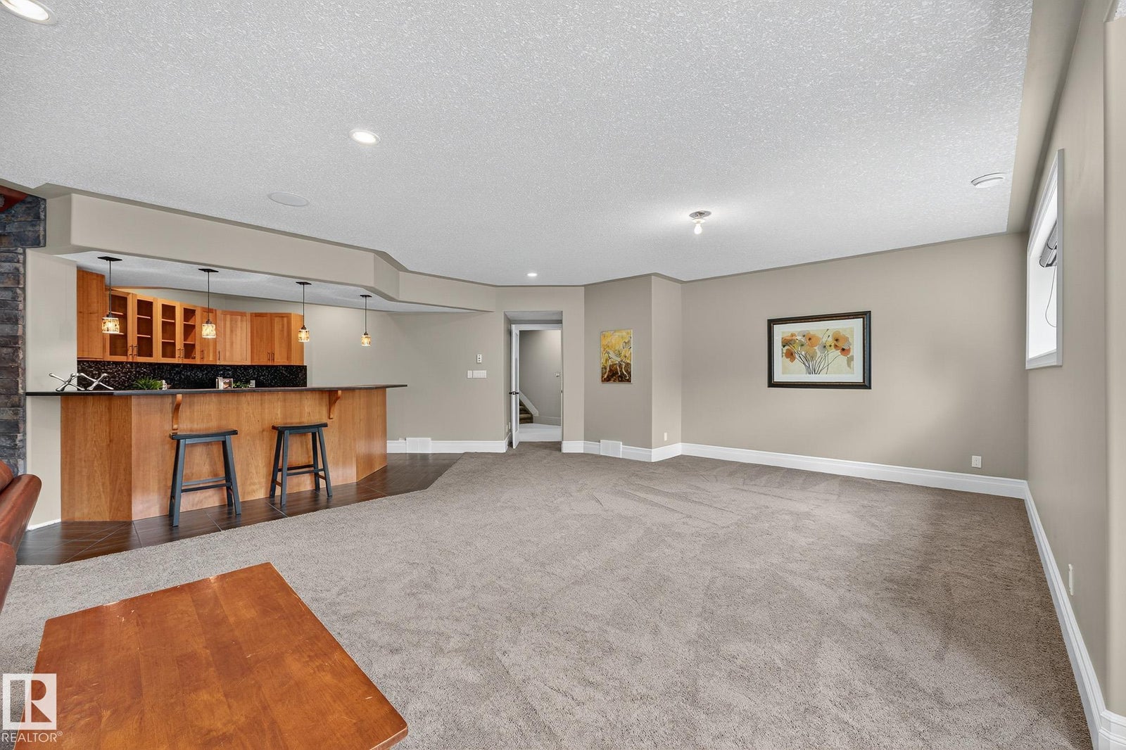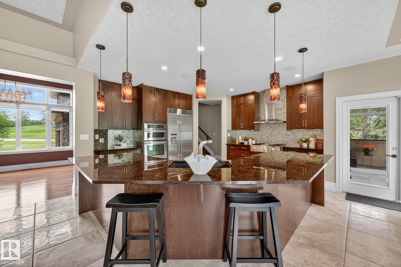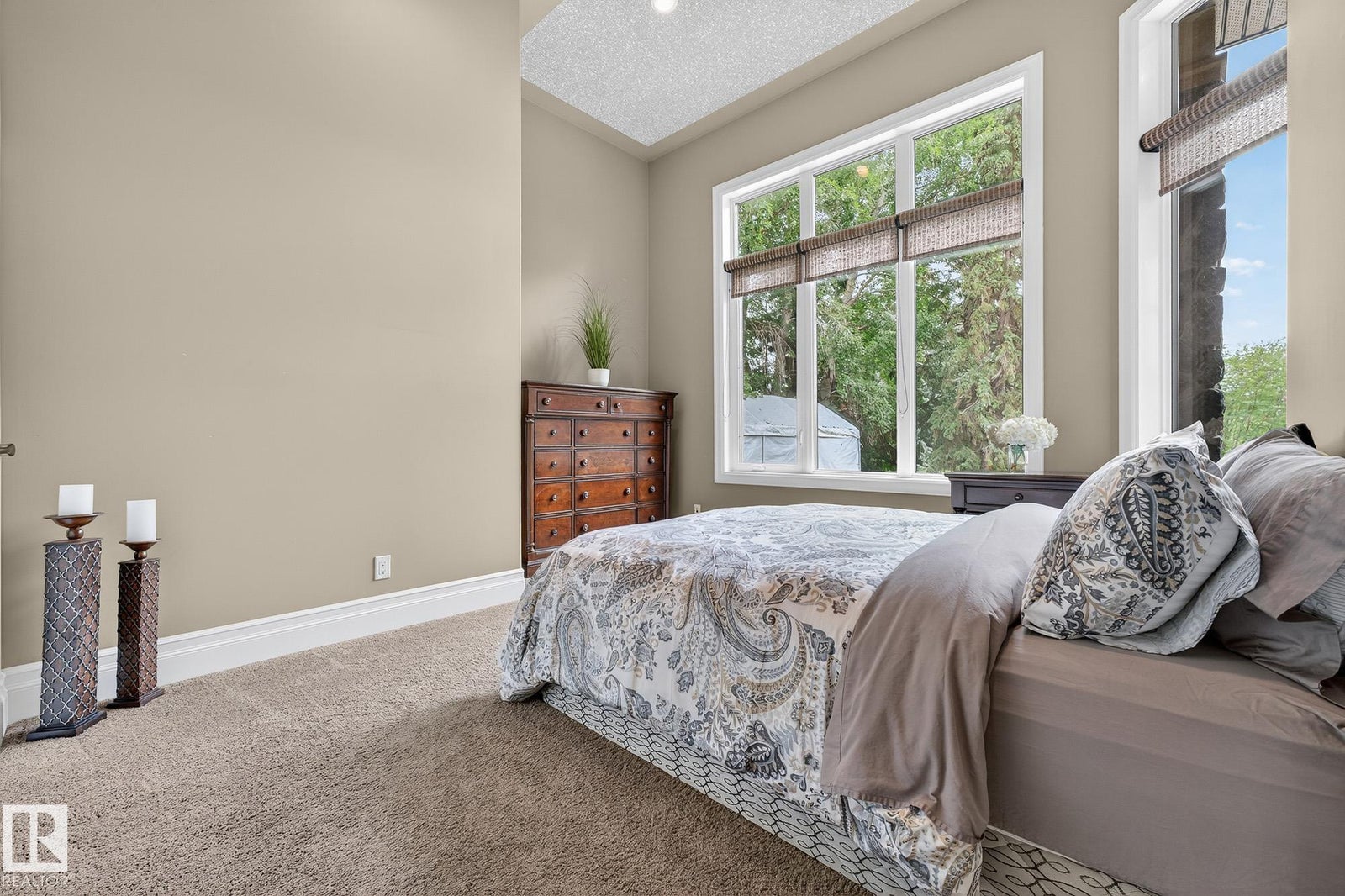 Welcome to Namao Ridge! This custom-built bungalow, situated on 1.67 acres, offers upscale living with unparalleled privacy. A dramatic curved staircase set against a stone feature wall, tray ceilings, and wall-to-wall windows elevate the open-concept main level. Enjoy a chef-inspired kitchen with rich cabinetry, granite countertops, and premium appliances, open to the living and dining areas, featuring a striking stone fireplace. The main floor includes the spacious primary suite, a second bedroom, and a formal dining room with architectural detailing. Downstairs features 3 bedrooms, a full bath, a half bath, a home gym, and a spacious rec room with room for a pool table. The show-stopping bar includes custom cabinetry, tile backsplash, and seating. A dedicated theatre room above the 4-car garage is perfect for movie nights. The 1,824sqft heated shop is finished with power, making it ideal for trades, storage, or your dream workspace. A covered patio and mature trees round out this exceptional property.